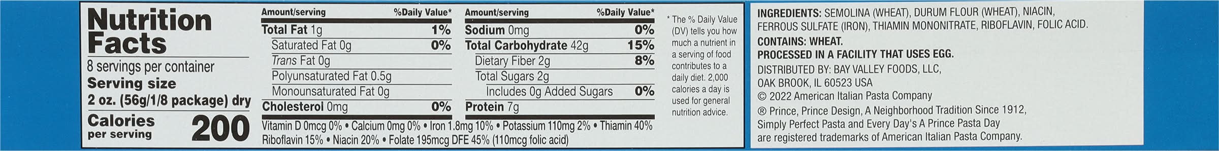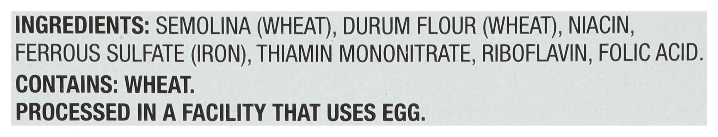 Ingredients: Semolina (Wheat), Durum Flour (Wheat), Niacin, Ferrous Sulfate (Iron), Thiamin Mononitrate, Riboflavin, Folic Acid Contains: Wheat, Eggs