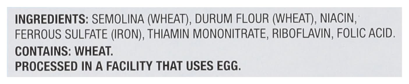Ingredients: Semolina (Wheat), Durum Flour (Wheat), Niacin, Ferrous Sulfate (Iron), Thiamin Mononitrate, Riboflavin, Folic Acid Contains: Wheat, Eggs