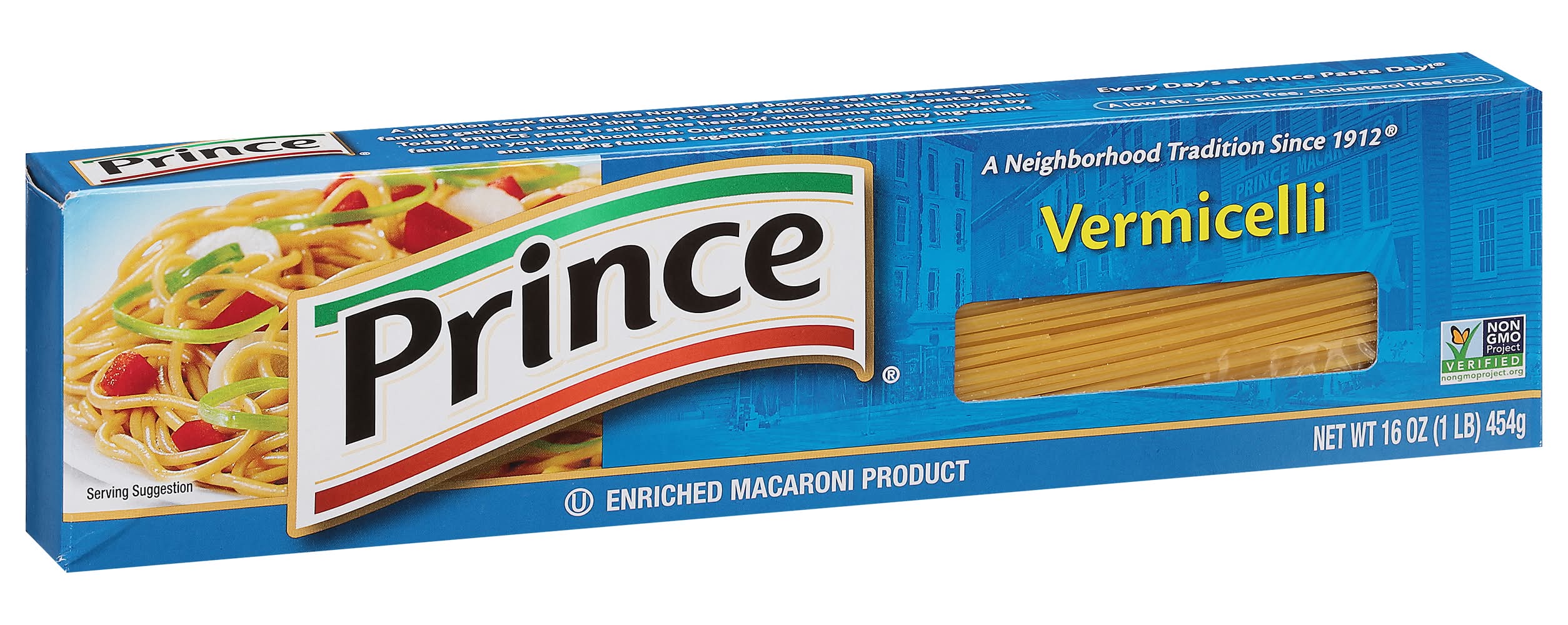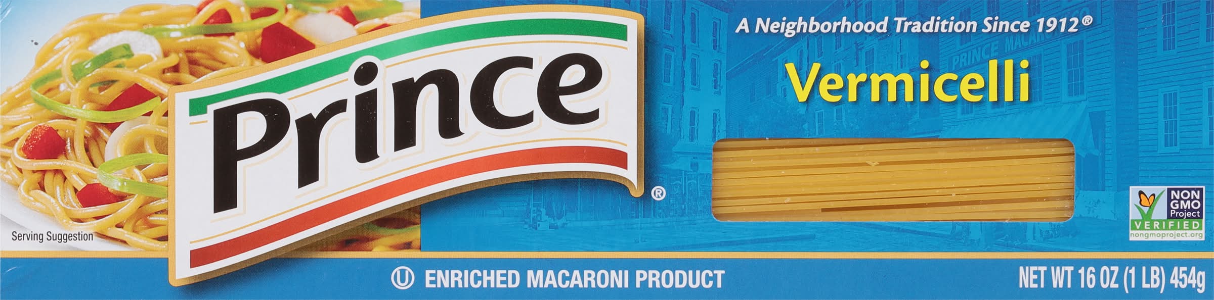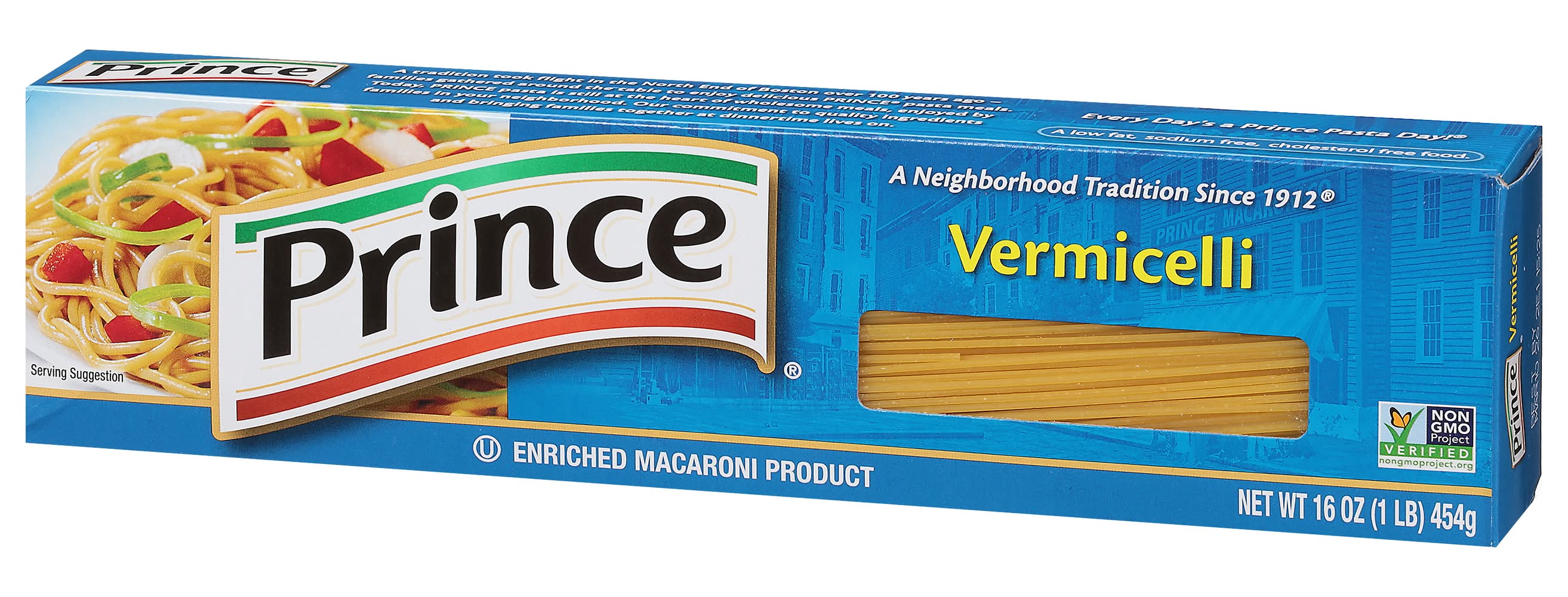 Enriched macaroni product that is low in fat and contains no sodium or cholesterol. Verified by the Non-GMO Project, it ensures adherence to non-genetically modified organism standards. With a history dating back over a century, Prince Vermicelli Pasta has become a staple in family meals, offering a commitment to quality ingredients. It is important to note that the contents of the package may settle, and the product is sold by weight, not by volume.