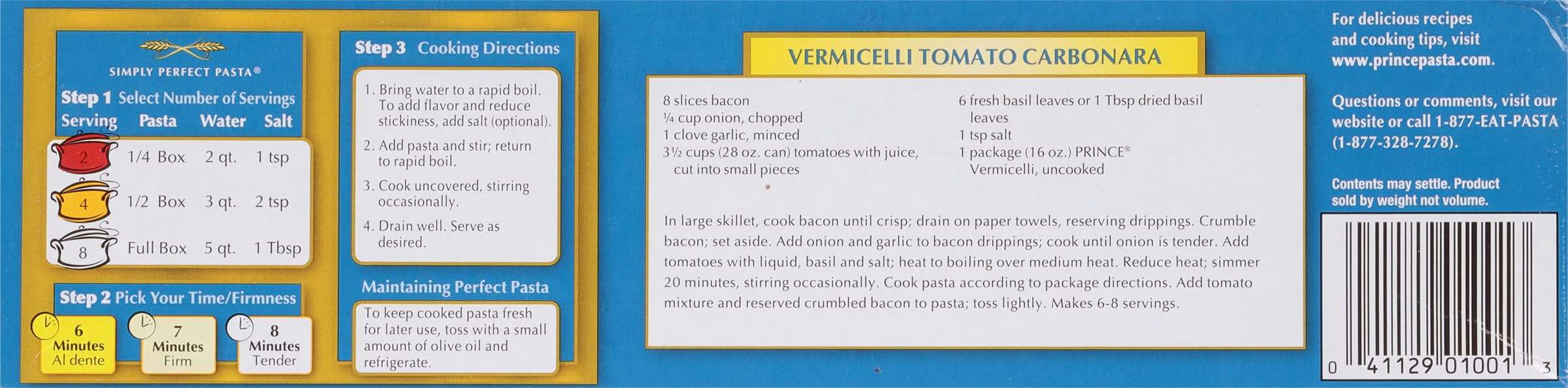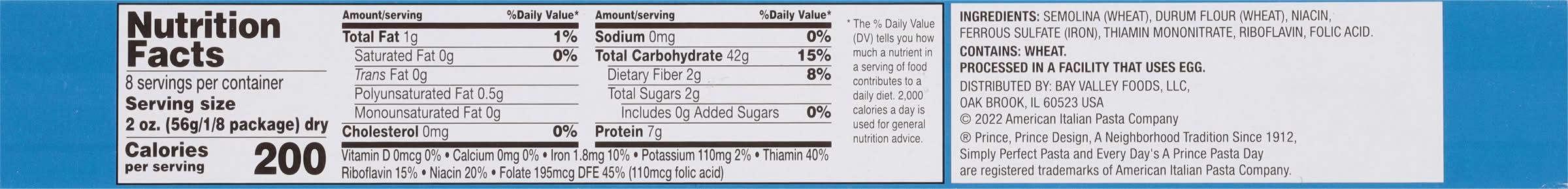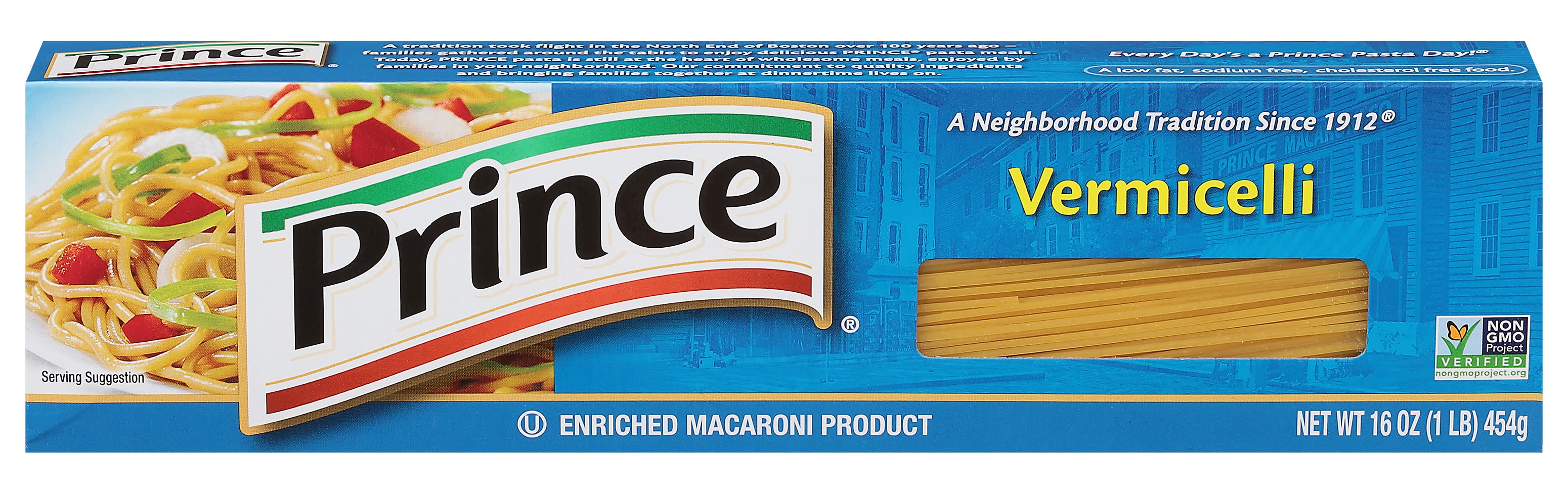 Enriched macaroni product that is low in fat and contains no sodium or cholesterol. Verified by the Non-GMO Project, it ensures adherence to non-genetically modified organism standards. With a history dating back over a century, Prince Vermicelli Pasta has become a staple in family meals, offering a commitment to quality ingredients. It is important to note that the contents of the package may settle, and the product is sold by weight, not by volume.
