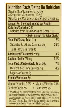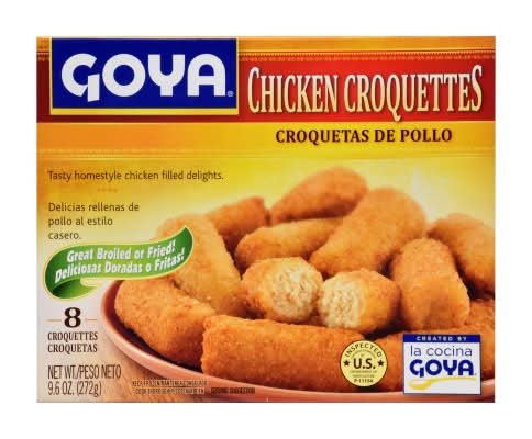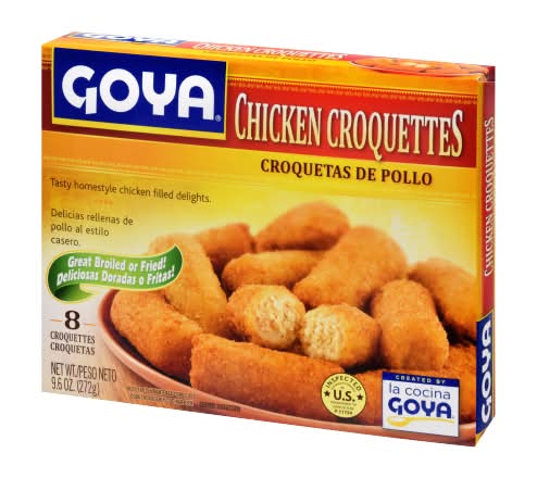 Goya Frozen Chicken Croquettes offer a convenient, ready-to-cook option for enjoying a traditional savory snack. Each package contains eight croquettes, totaling 9.6 ounces, and is designed to deliver the comforting taste of breaded, minced chicken in a classic croquette form. These croquettes are suitable for baking or frying, providing a versatile approach to preparation according to personal preference or dietary needs.
