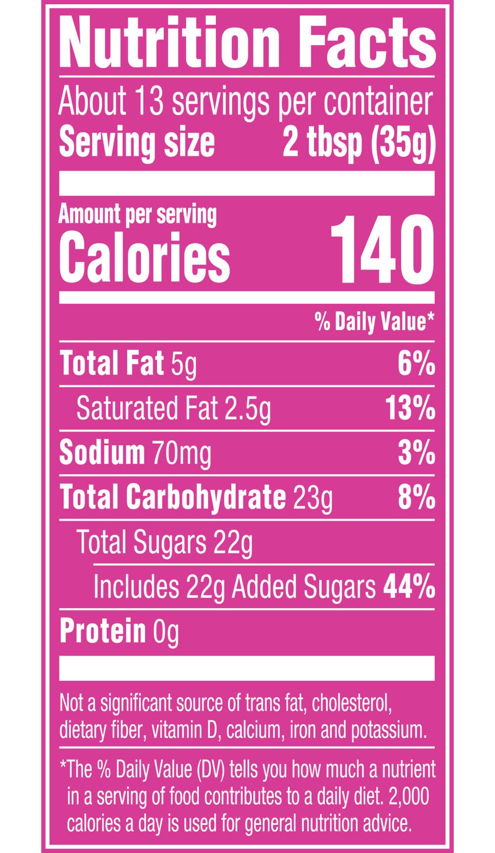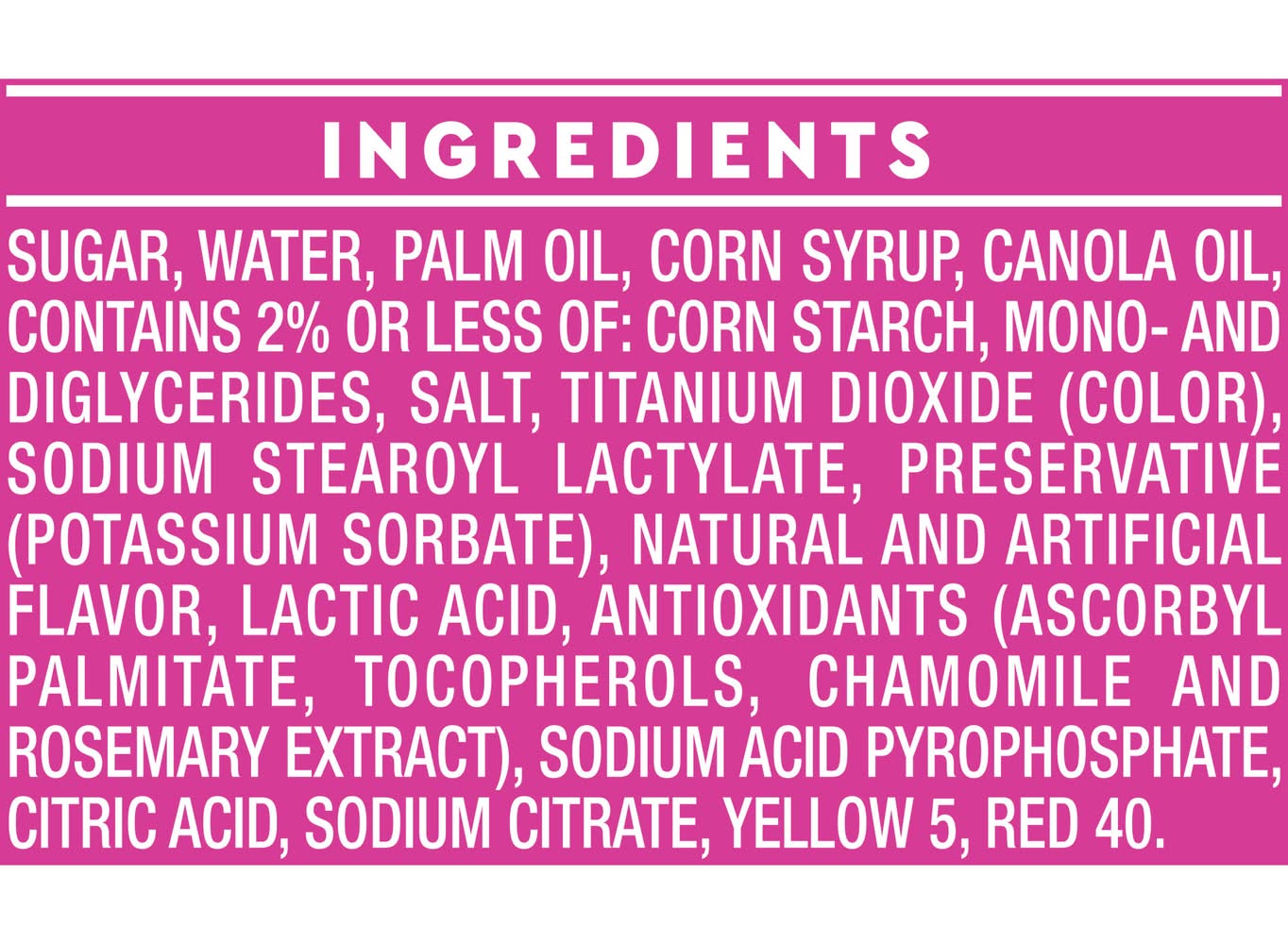 Ingredients: INGREDIENTS: SUGAR, WATER, PALM OIL, CORN SYRUP, CANOLA OIL, CONTAINS 2% OR LESS OF: CORN STARCH, MONO AND DIGLYCERIDES, SALT, TITANIUM DIOXIDE (COLOR), SODIUM STEAROYL LACTYLATE, PRESERVATIVE (POTASSIUM SORBATE), NATURAL AND ARTIFICIAL FLAVOR, LACTIC ACID, ANTIOXIDANTS (ASCORBYL PALMITATE, TOCOPHEROLS, CHAMOMILE AND ROSEMARY EXTRACT), SODIUM ACID PYROPHOSPHATE, CITRIC ACID, SODIUM CITRATE, YELLOW 5, RED 40.