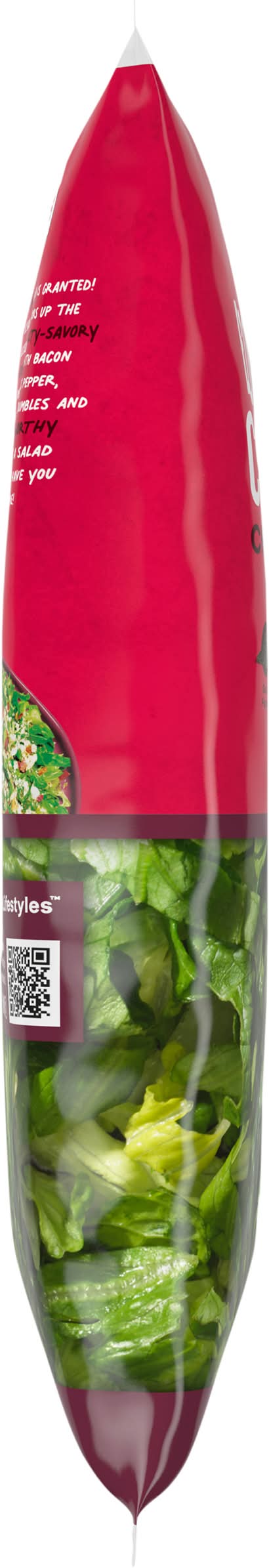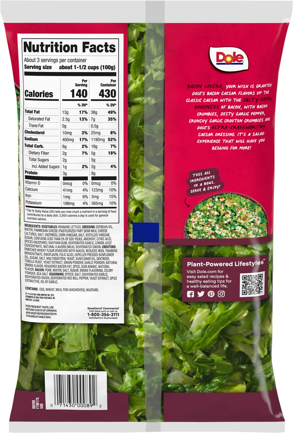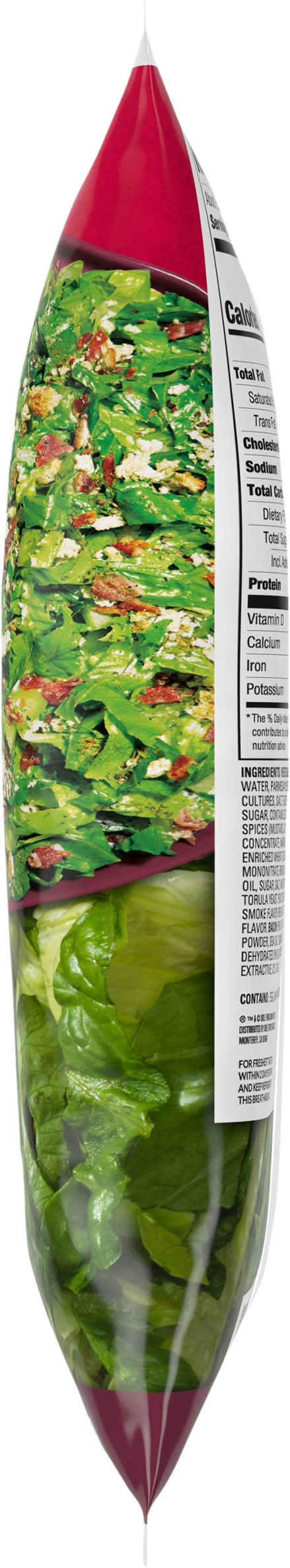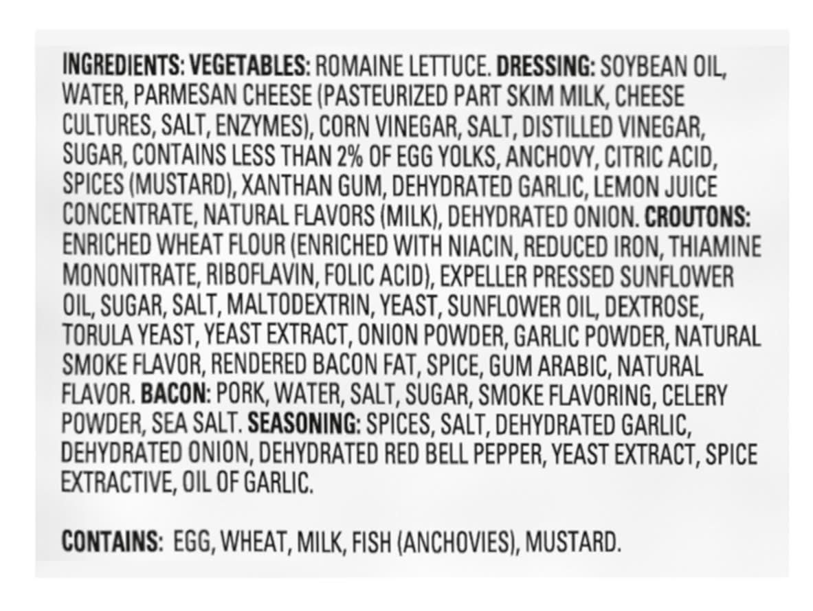 Ingredients: Vegetables: Romaine Lettuce, Dressing: Soybean Oil, Water, Parmesan Cheese (Cultured Part Skim Milk, Cheese Cultures, Salt, Enzymes), Corn Vinegar, Salt, Distilled Vinegar, Sugar, Contains Less than 2% of Egg Yolks, Anchovy, Citric Acid, Spices (Mustard), Xanthan Gum, Dehydrated Garlic, Lemon Juice Concentrate, Natural Flavors (Milk), Dehydrated Onion, Croutons: Enriched Wheat Flour (Enriched with Niacin, Reduced Iron, Thiamine Mononitrate, Riboflavin, Folic Acid), Expeller Pressed Sunflower Oil, Sugar, Salt, Maltodextrin, Yeast, Sunflower Oil, Dextrose, Torula Yeast, Yeast Extract, Onion Powder, Garlic Powder, Natural Smoke Flavor, Rendered Bacon Fat, Spice, Gum Arabic, Natural Flavor, Bacon: Pork, Water, Salt, Sugar, Smoke Flavoring, Celery Powder, Sea Salt, Seasoning: Spices, Salt, Dehydrated Garlic, Dehydrated Onion, Dehydrated Red Bell Pepper, Yeast Extract, Spice Extractive, Oil of Garlic Contains: Soybeans, Milk, Eggs, Fish, Anchovy, Mustard, Wheat, Celery