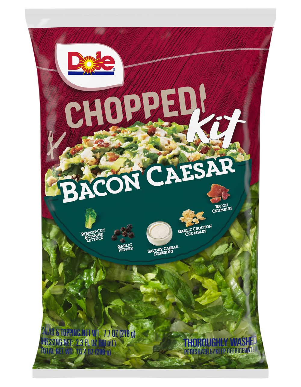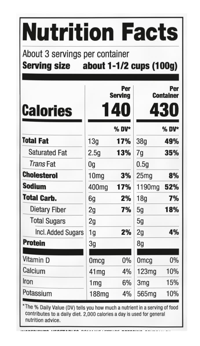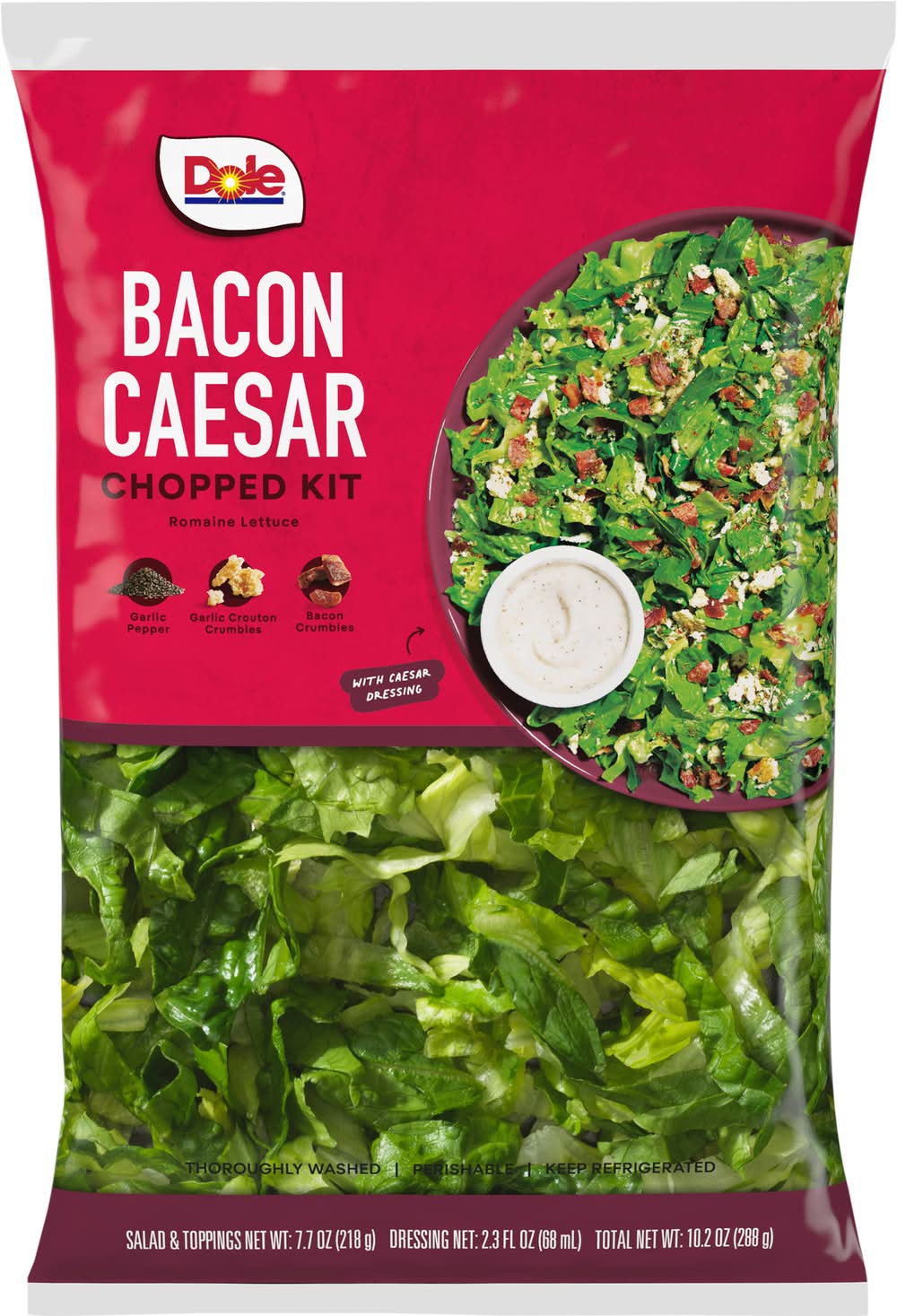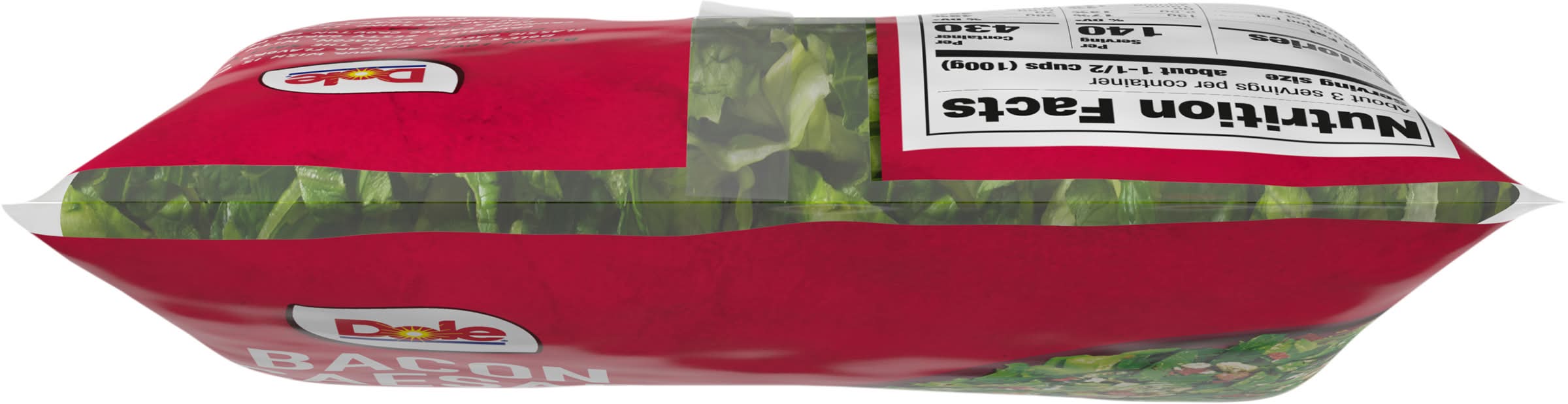 Ingredients: Vegetables: Romaine Lettuce, Dressing: Soybean Oil, Water, Parmesan Cheese (Cultured Part Skim Milk, Cheese Cultures, Salt, Enzymes), Corn Vinegar, Salt, Distilled Vinegar, Sugar, Contains Less than 2% of Egg Yolks, Anchovy, Citric Acid, Spices (Mustard), Xanthan Gum, Dehydrated Garlic, Lemon Juice Concentrate, Natural Flavors (Milk), Dehydrated Onion, Croutons: Enriched Wheat Flour (Enriched with Niacin, Reduced Iron, Thiamine Mononitrate, Riboflavin, Folic Acid), Expeller Pressed Sunflower Oil, Sugar, Salt, Maltodextrin, Yeast, Sunflower Oil, Dextrose, Torula Yeast, Yeast Extract, Onion Powder, Garlic Powder, Natural Smoke Flavor, Rendered Bacon Fat, Spice, Gum Arabic, Natural Flavor, Bacon: Pork, Water, Salt, Sugar, Smoke Flavoring, Celery Powder, Sea Salt, Seasoning: Spices, Salt, Dehydrated Garlic, Dehydrated Onion, Dehydrated Red Bell Pepper, Yeast Extract, Spice Extractive, Oil of Garlic Contains: Soybeans, Milk, Eggs, Fish, Anchovy, Mustard, Wheat, Celery