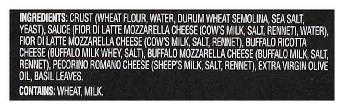 Ingredients: Crust (Wheat Flour, Water, Durum Wheat Semolina, Sea Salt, Yeast) Sauce (Fior Di Latte Mozzarella Cheese {Cow's Milk, Salt, Rennet}, Water), Fior Di Latte Mozzarella Cheese (Cow's Milk, Salt, Rennet) Buffalo Ricotta Cheese (Buffalo Milk Whey, Salt), Buffalo Mozzarella Cheese (Buffalo Milk, Salt, Rennet) Pecorino Romano Cheese (Sheep's Milk, Salt, Rennet) Extra Virgin Olive Oil Basil Leaves. Contains: Wheat, Milk
