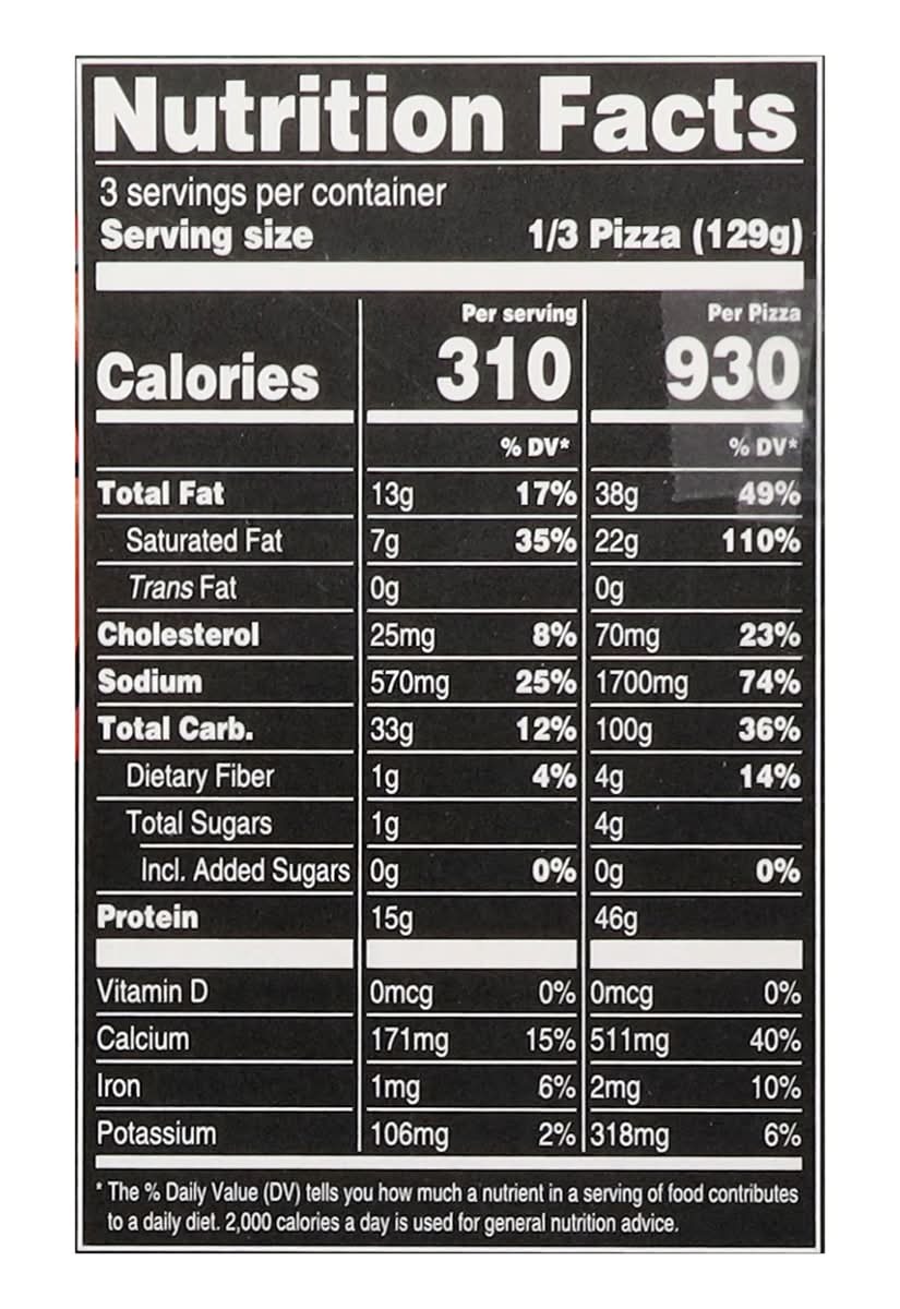 Directions for use: Directions: Important Food Safety Instructions: Keep pizza frozen prior to baking. Do not eat pizza without cooking. Remove pizza from box, over-wrap and cardboard. Pizza is done when cheese is completely melted and edges are golden brown. Let pizza stand 3-5 minutes before serving. Refrigerate or discard any unused portion. Cook thoroughly. Cooking Instructions: Preheat oven to 425 degrees F. Oven temperatures may vary. Adjust baking time and oven temperature as necessary. Place pizza directly on oven rack. For best results, do not bake pizza on cookie sheet. Bake 11-13 minutes. Let the pizza cool for a few minutes, then enjoy! Keep frozen. Pull tab to open. Storage recommendation: Keep frozen.