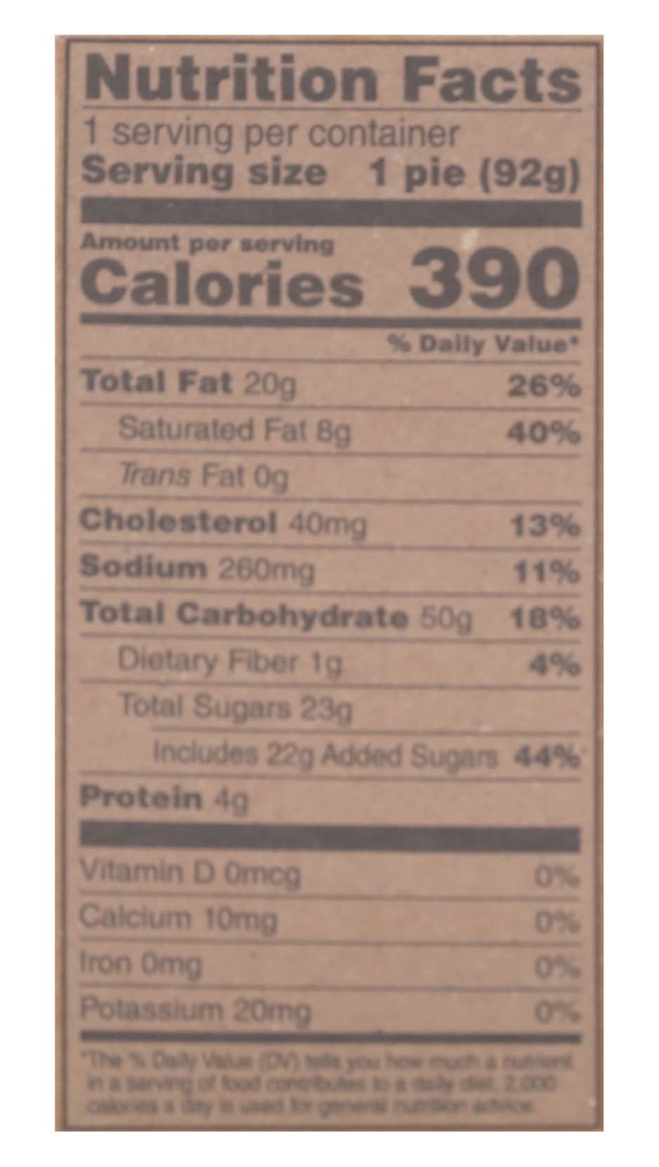 Naturally flavored. Per 1 Pie: 390 calories, 8 g sat fat (43% DV), 260 mg sodium (11% DV), 23 g total sugars. Our promise: guaranty & satisfaction 100% guaranteed on your manufacture. www.betterlivingbrandsLLC.com Smartlabel: Scan here for more foods information or call 1-888-723-3929. • Better Living Brands LLC, PO Box 99 Pleasanton, CA 94566-0009 • Packaging: Reusable