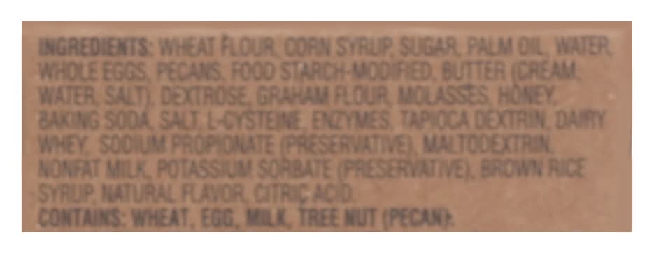 Ingredients: Wheat Flour, Corn Syrup, Sugar, Palm Oil, Water, Whole Eggs, Pecans, Food Starch Modified, Butter (Cream, Water, Salt), Dextrose, Graham Flour, Molasses, Honey, Baking Soda, Salt, L-Cysteine, Enzymes, Tapioca Dextrin, Dairy, Whey, Sodium Propionate (Preservative), Maltodextrin, Nonfat Milk, Potassium Sorbate (Preservative), Brown Rice Syrup, Natural Flavor, Citric Acid. Contains: Wheat, Eggs, Milk, Tree Nuts, Soybeans, Tree Nuts