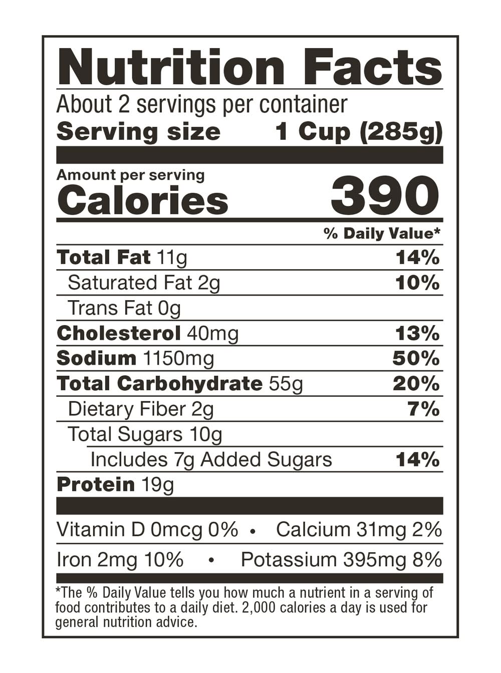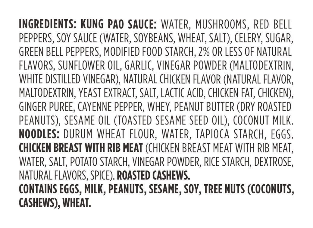 Ingredients: Kung Pao Sauce: Water, Mushrooms, Red Bell Peppers, Soy Sauce (Water, Sa(Beans, Wheat, Salt), Celery, Sugar, Green Bell Peppers, Modified Food Starch, 2% or Less of Natural Flavors, Sunflower Oil, Garlic, Vinegar Powder (Maltodextrin, White Distilled Vinegar), Natural Chicken Flavor (Natural Flavor, Maltodextrin, Yeast Extract, Salt, Lactic Acid, Chicken Fat, Chicken), Ginger Puree, Cayenne Pepper, Whey, Peanut Butter (Dry Roasted Peanuts), Sesame Oil (Toasted Sesame Seed Oil), Coconut Milk, Noodles: Durum Wheat Flour, Water, Tapioca Starch, Eggs, Chicken Breast with Rib Neat (Chicken Breast Meat with Rib Meat, Water, Salt, Potato Starch, Vinegar Powder, Rice Starch, Dextrose, Natural Flavors, Slice), Roasted Cashews Contains: Eggs, Milk, Peanuts, Sesame, Soybeans, Tree Nuts, Coconuts, Tree Nuts, Cashews, Wheat, Celery