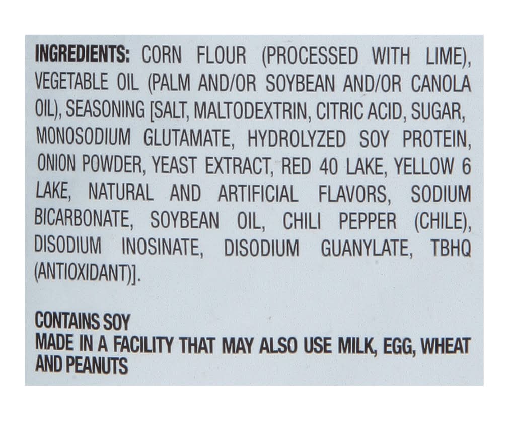 Ingredients: Corn Flour (Processed With Lime), Vegetable Oil (Palm And/Or Soybean And/Or Canola Oil), Seasoning [Salt, Maltodextrin, Citric Acid, Sugar, Monosodium Glutamate, Hydrolyzed Soy Protein, Onion Powder, Yeast Extract, Red 40 Lake, Yellow 6 Lake, Natural And Artificial Flavors, Sodium Bicarbonate, Soybean Oil, Chili Pepper (Chile), Disodium Inosinate, Disodium Guanylate, Tbhq (Antioxidant)].