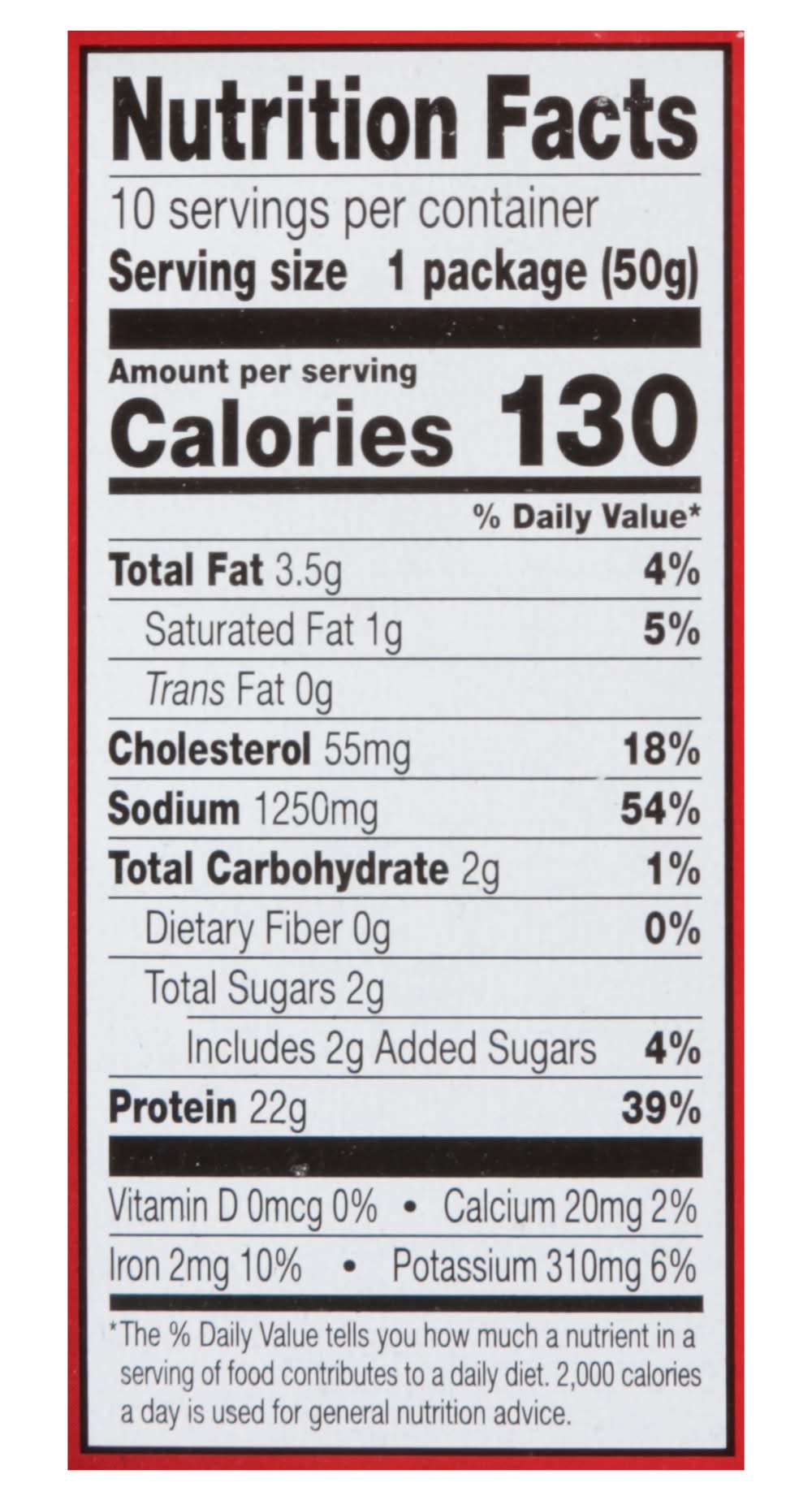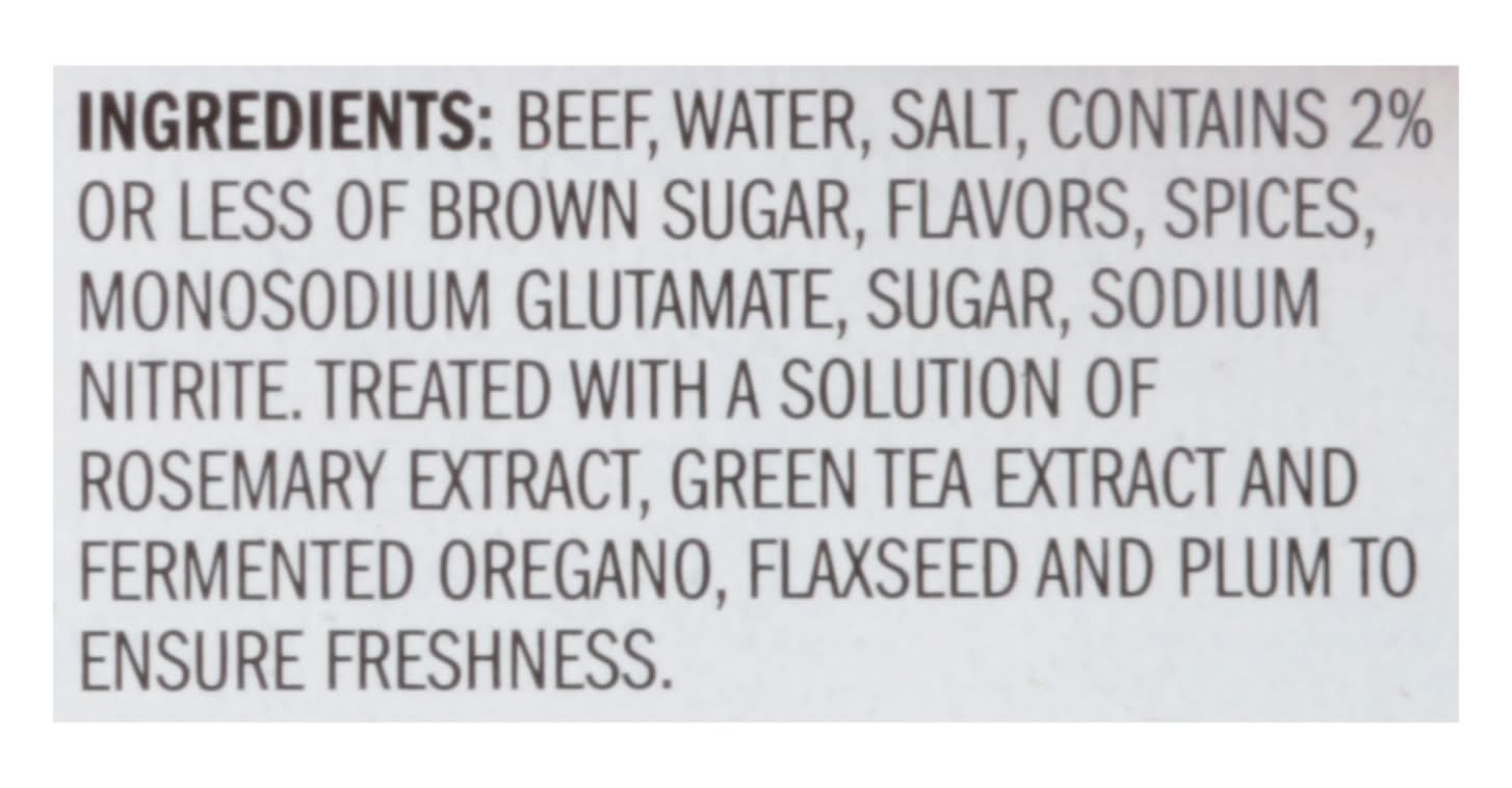 Ingredients: Beef, Water, Salt, Contains 2% or Less of Brown Sugar, Flavors, Spices, Monosodium Glutamate, Sugar, Sodium Nitrite. Treated with a Solution of Rosemary Extract, Green Tea Extract and Fermented Oregano, Flaxseed and Plum to Ensure Freshness