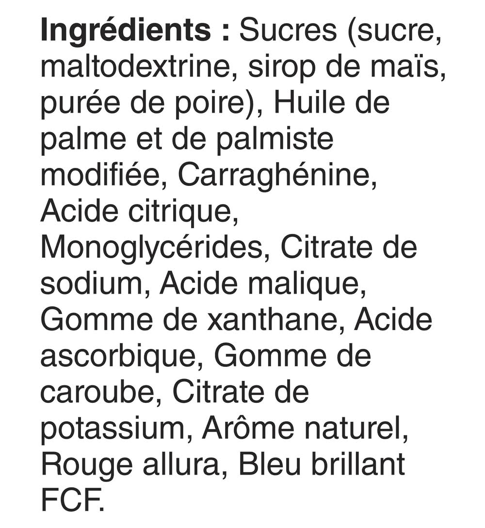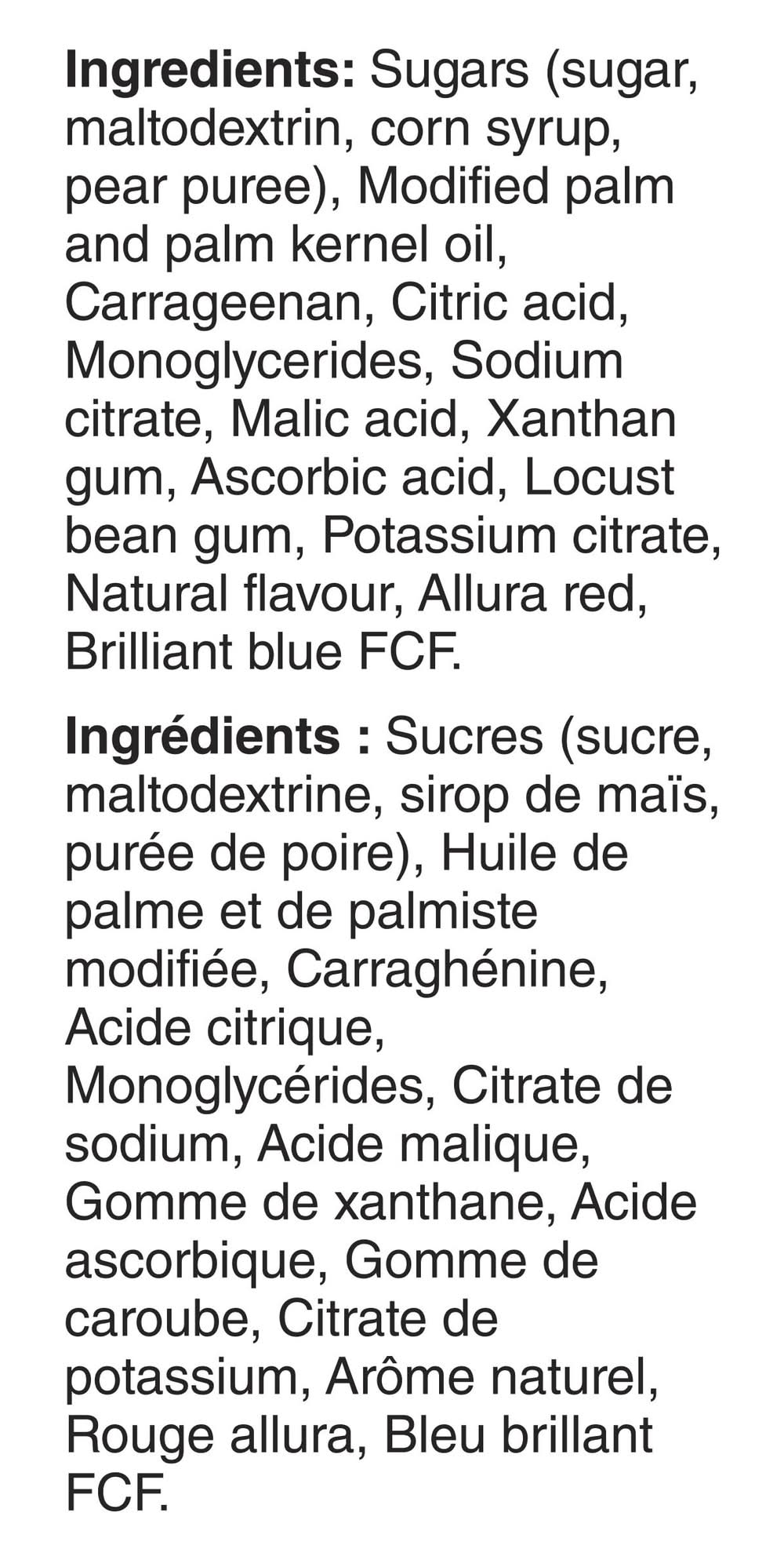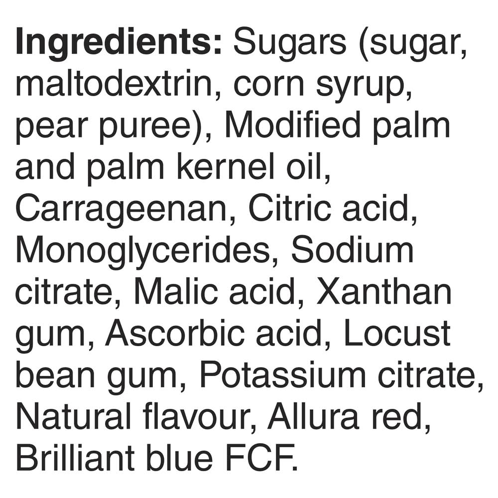 Ingredients: Sugars (sugar, maltodextrin, corn syrup, pear puree), Modified palm and palm kernel oil, Carrageenan, Citric acid, Monoglycerides, Sodium citrate, Malic acid, Xanthan gum, Ascorbic acid, Locust bean gum, Potassium citrate, Natural flavour, Allura red, Brilliant blue FCF