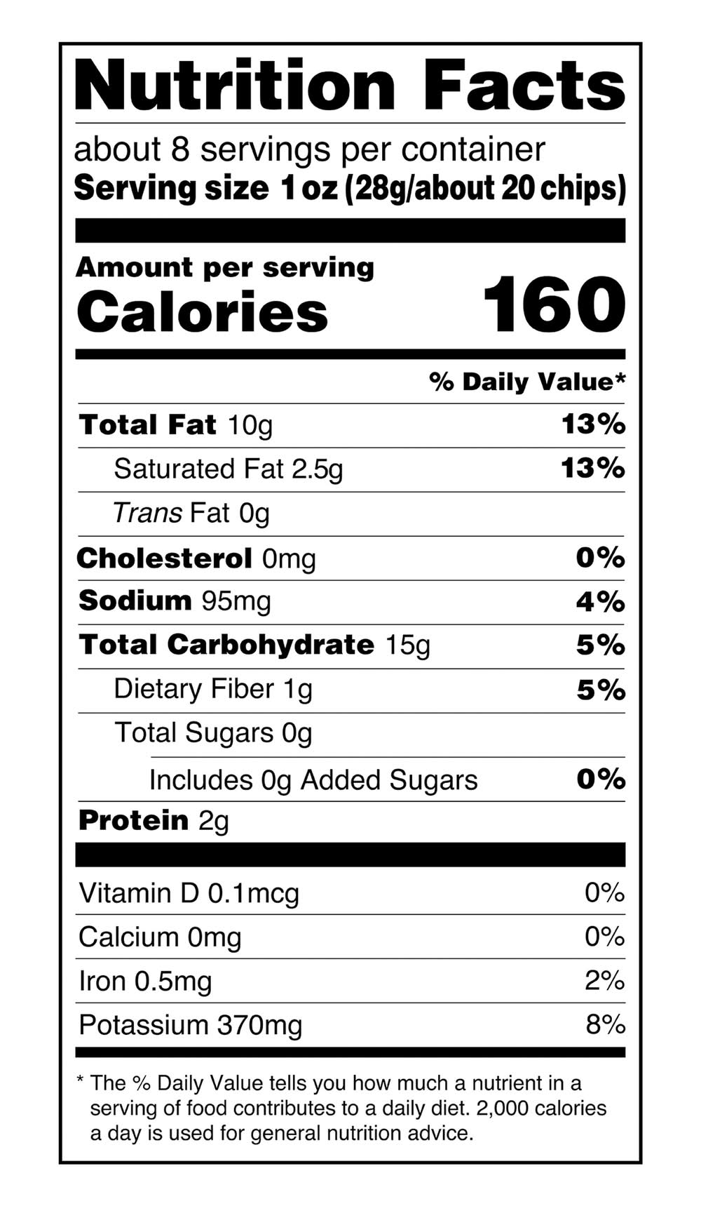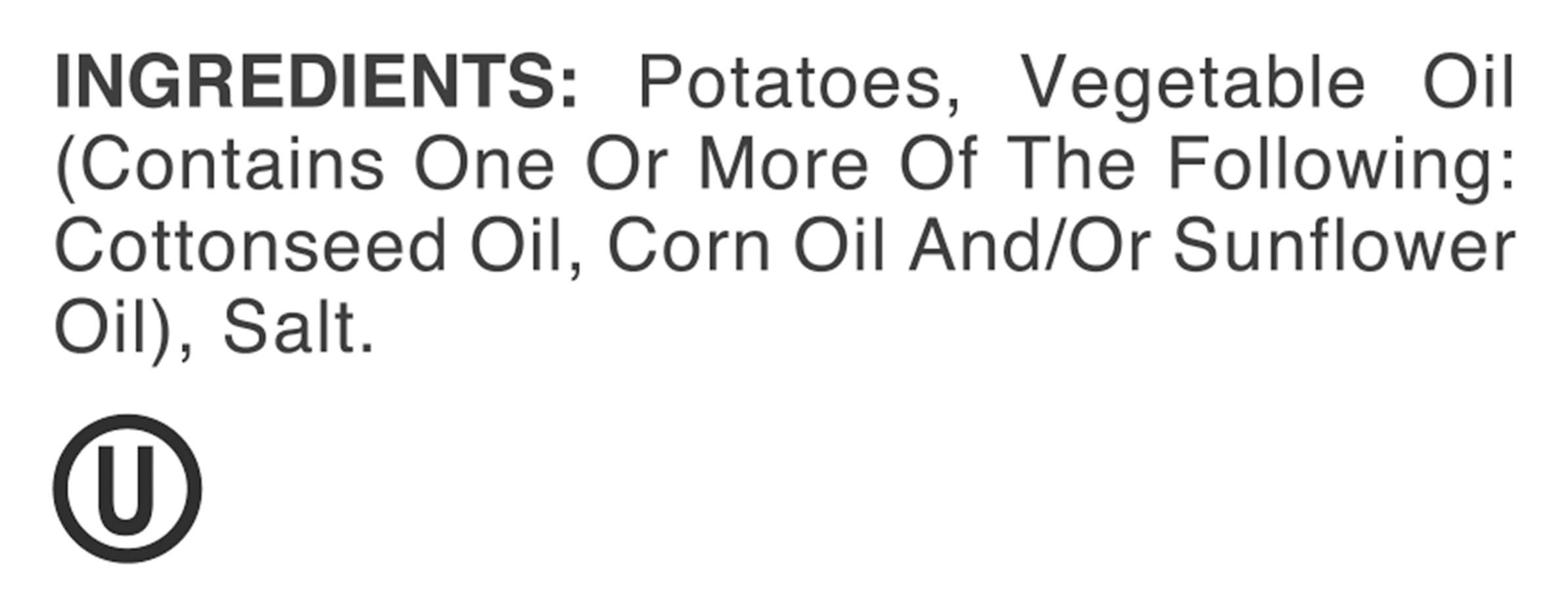 Ingredients: Potatoes, Vegetable Oil (Contains One or More of the Following: Cottonseed Oil, Corn Oil and/or Sunflower Oil), Salt