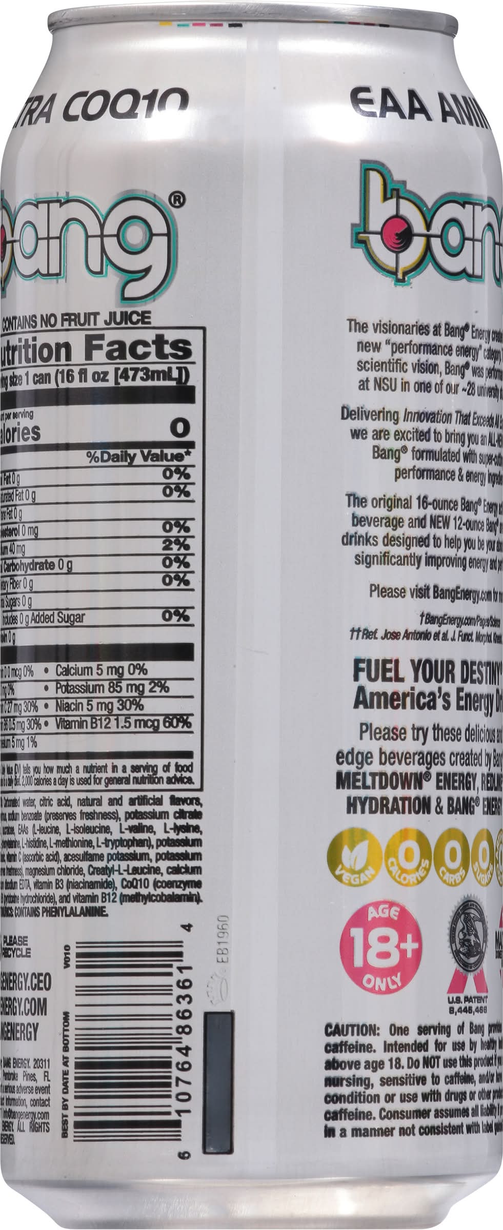 Energy Drink, Power Punch • Brand: Bang • vegan, gluten-free, • Vital Pharmaceuticals, Inc., 1600 North Park Drive,Weston,FL,33326 • Packaging: Reusable