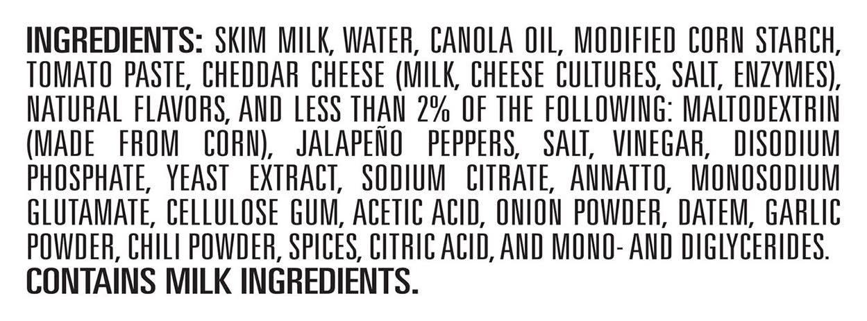Ingredients: Skim Milk, Water, Canola Oil, Modified Corn Starch, Tomato Paste, Cheddar Cheese (Milk, Cheese Cultures, Salt, Enzymes), Natural Flavors, and Less than 2% of the Following: Maltodextrin (Made from Corn), Jalapeno Peppers, Salt, Vinegar, Disodium Phosphate, Yeast Extract, Sodium Citrate, Annatto, Monosodium Glutamate, Cellulose Gum, Acetic Acid, Onion Powder, DATEM, Garlic Powder, Chili Powder, Spices, Citric Acid, and Mono- and Diglycerides Contains: Milk