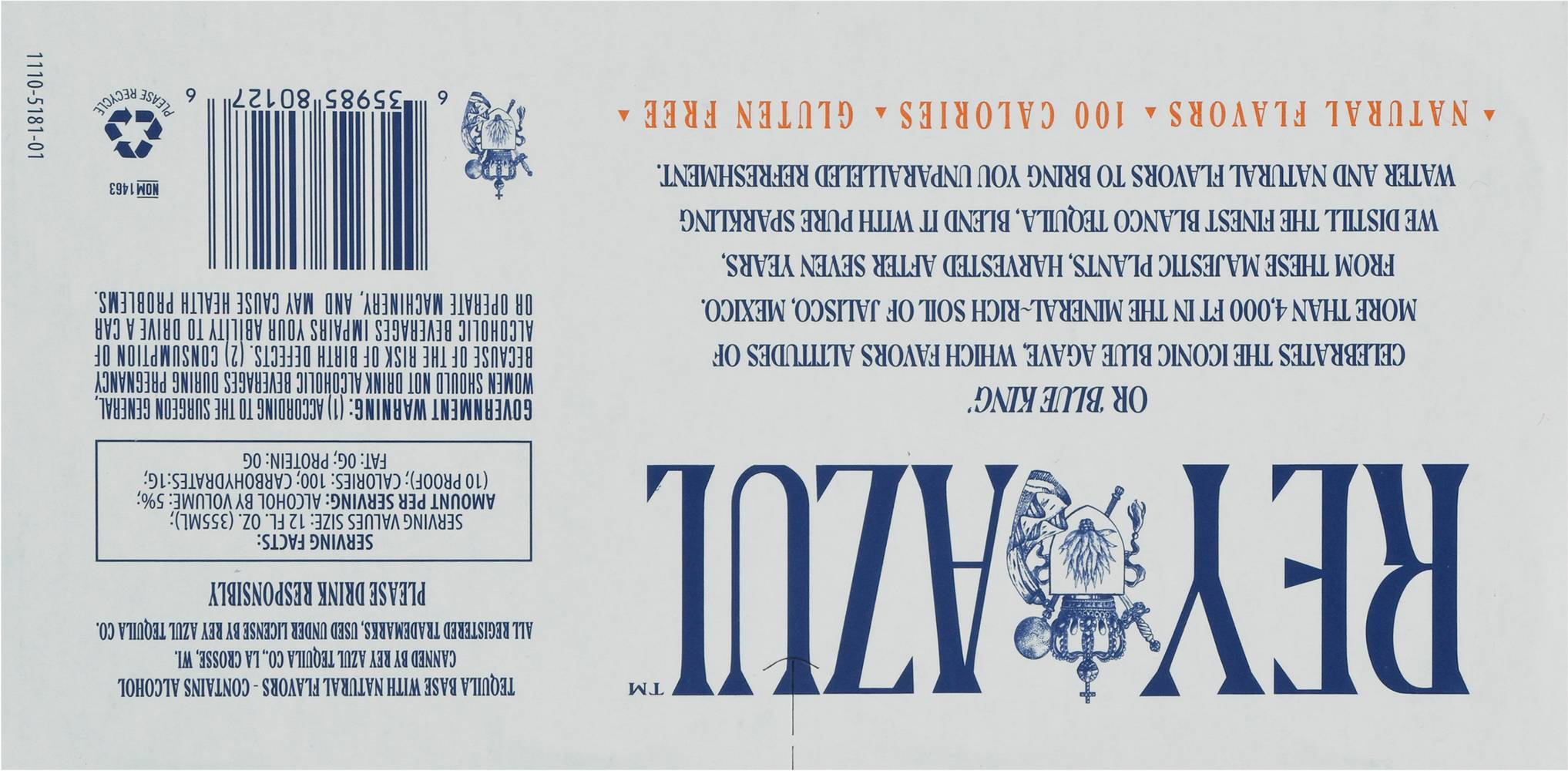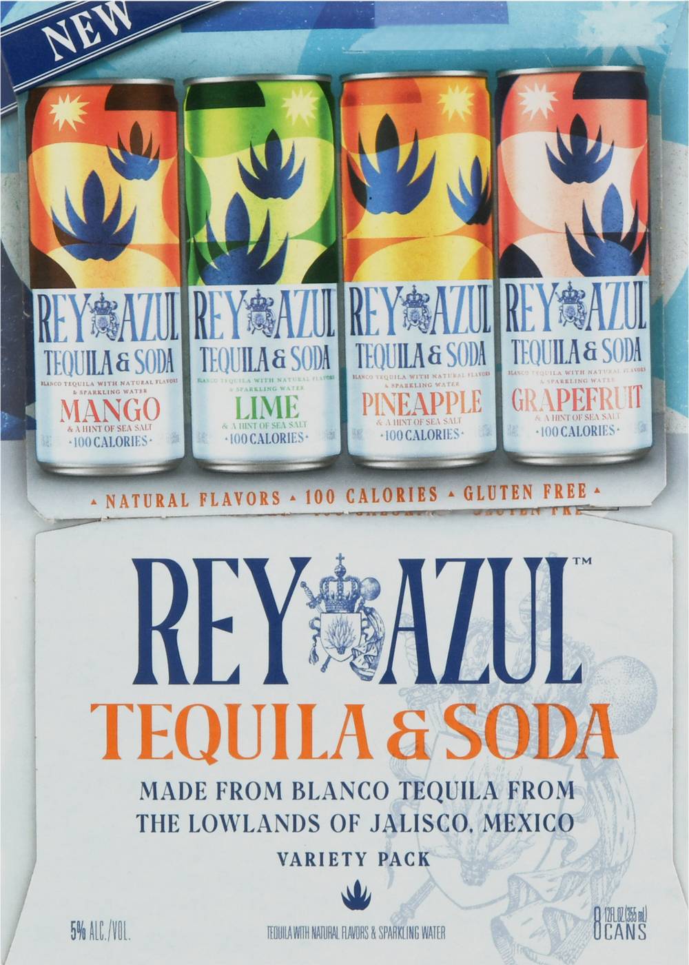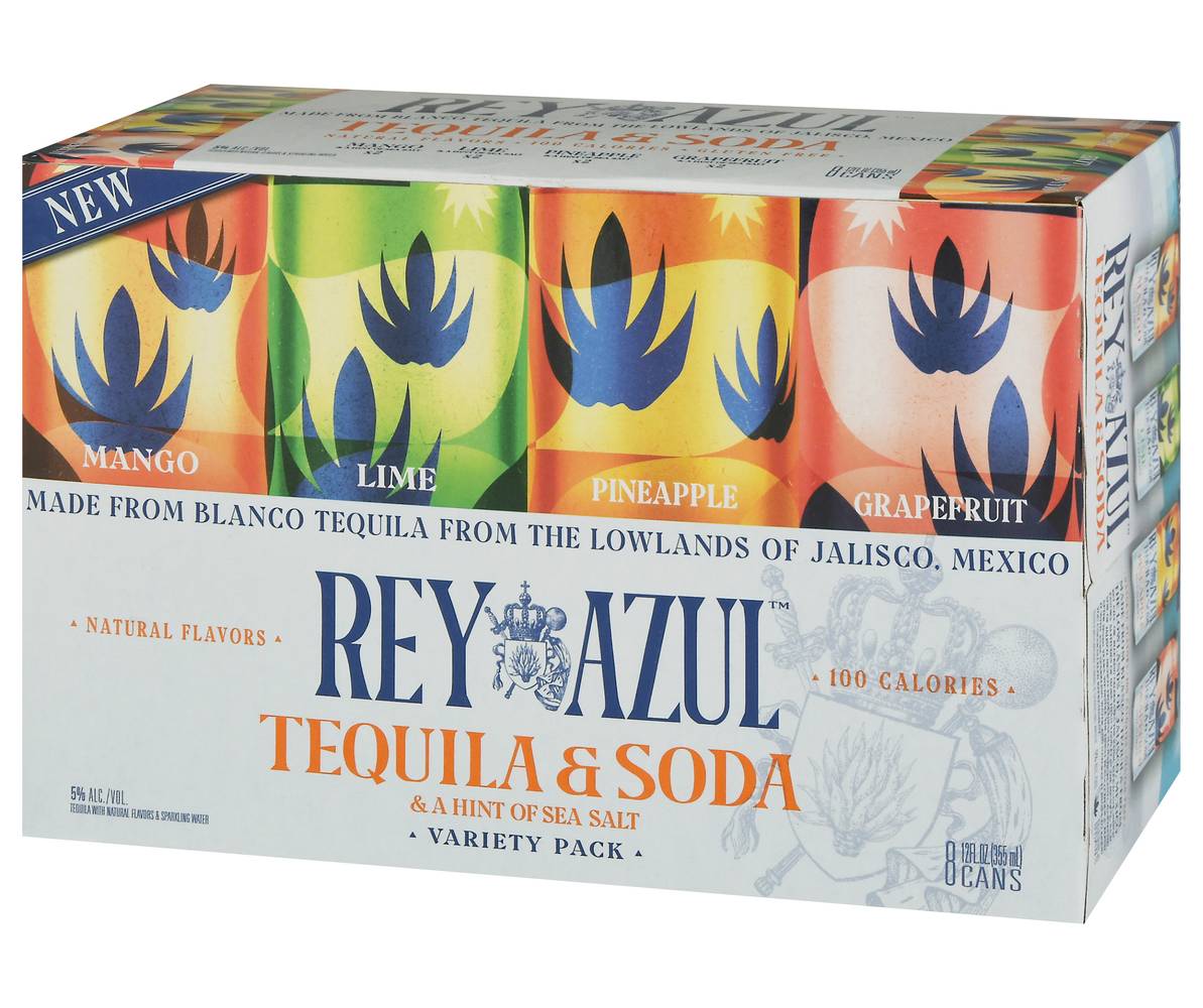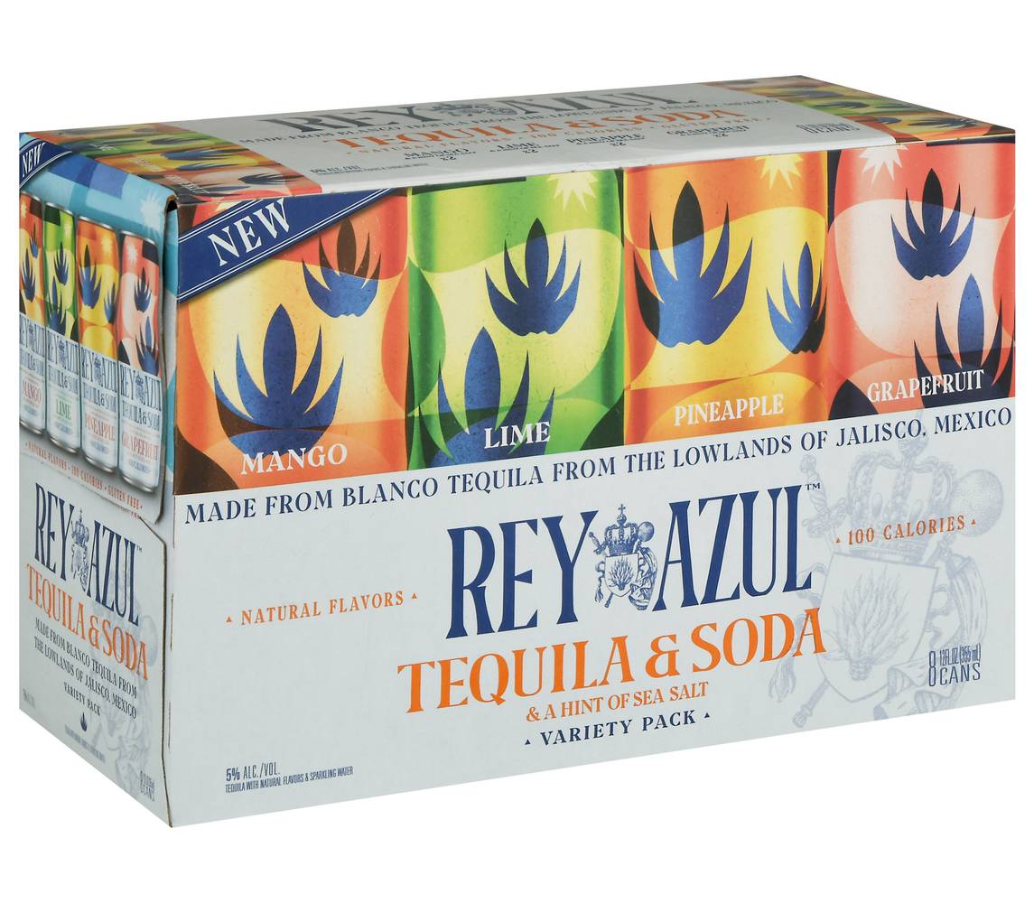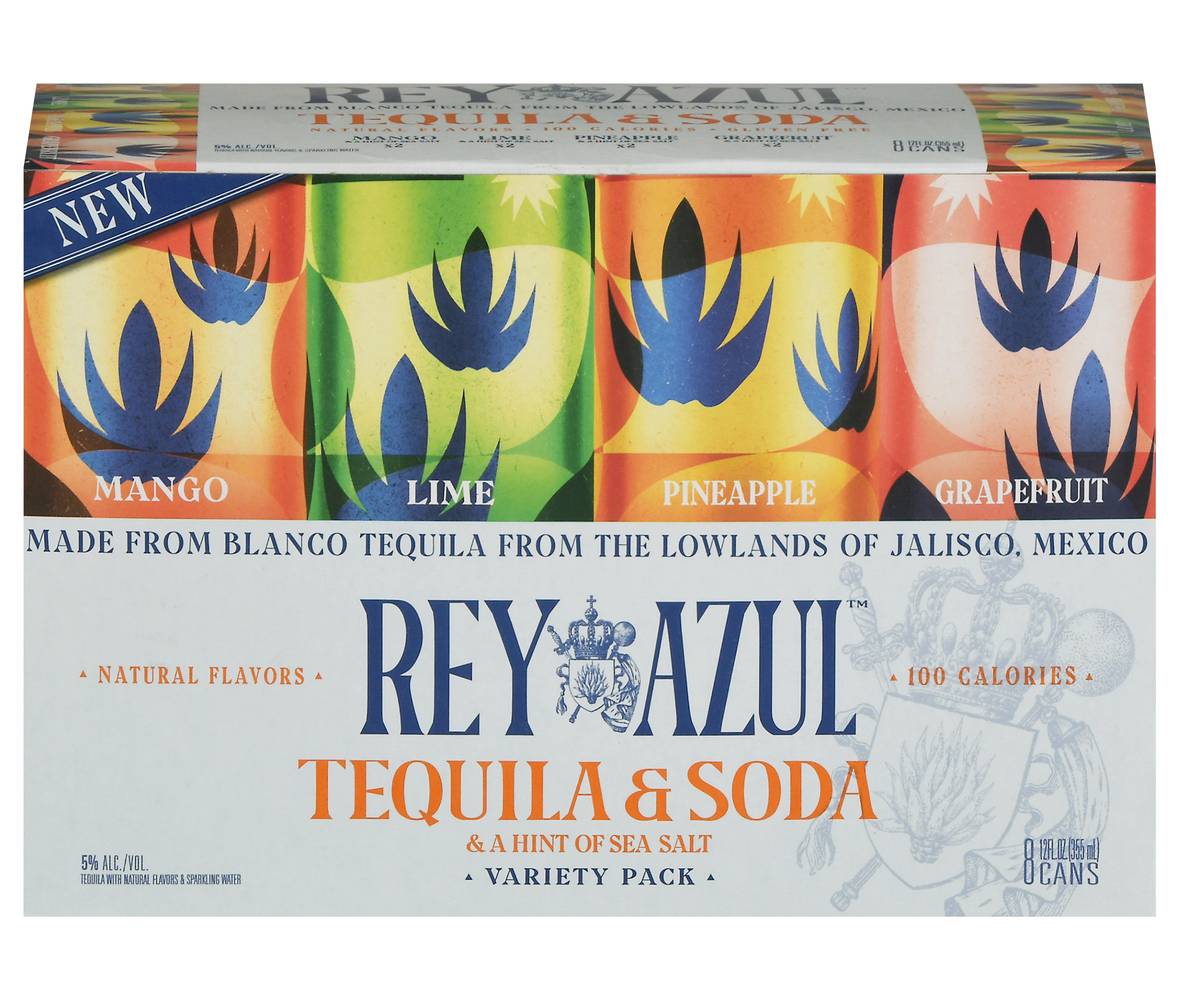 Tequila & soda a hint of sea salt. Mango & a hint of sea salt x2. Lime & a hint of sea salt x2. Pineapple & a hint of sea salt x2. Grapefruit & a hint of sea salt x2. Natural flavor. Tequila with natural flavors & sparkling water. 100 calories. Gluten free. New. Blanco tequila with natural flavor & sparkling water. Rey azul, or blue king celebrates the iconic blue agave, which favors altitudes of more than 4.000 ft in the mineral-rich soil of Jalisco, Mexico. From these majestic plants, harvested after seven years, we distill the finest Blanco tequila. Blend it with pure sparkling water and natural flavors to bring. Or blue king celebrates the iconic blue agave which favors altitudes of more than 4000 ft in the mineral-rich soil of Jalisco, Mexico. From these majestic plants, harvested after seven years, we distill the finest Blanco tequila. Blend it with pure sparkling water and natural flavors to bring you unparalleled refreshment. Please drink responsibly. Tequila base with natural flavors - contains alcohol. Please recycle. 5% ALC./VOl. 10 Made from Blanco Tequila form the lowlands of Jalisco. Mexico. Canned by Rey Azul Tequila Co, LA Crosse, WI. • Pack size: 8 • Alcohol by volume: 5% • Rey Azul Tequila Co., 123 Main Street, Los Angeles, CA 90001 • Packaging: Reusable