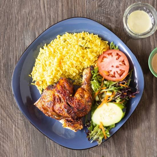 Quarter portion of our signature chicken served with two sides of your choice. Includes one spicy and one mild sauce.