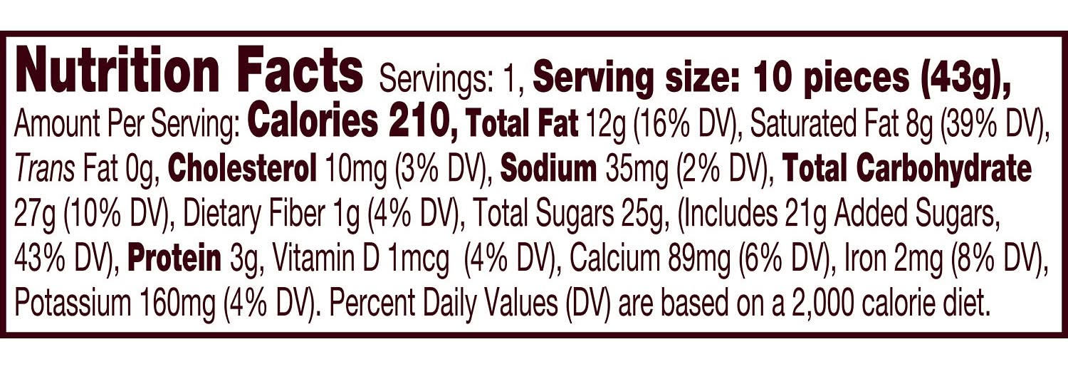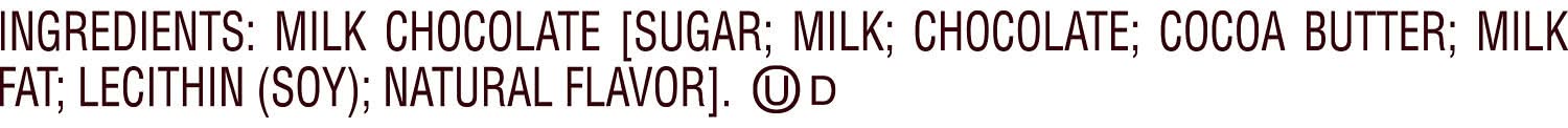 Ingredients: Milk Chocolate Sugar, Milk, Chocolate, Cocoa Butter, Lactose, Milk Fat, Soy Lecithin, Vanillin, Artificial Flavor, PGPR, Emulsifier.