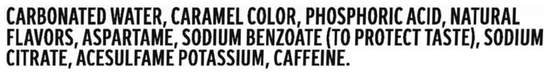 Ingredients: Carbonated Water, Caramel Color, Phosphoric Acid, Natural Flavors, Aspartame, Sodium Benzoate (to Protect Taste), Sodium Citrate, Acesulfame Potassium, Caffeine