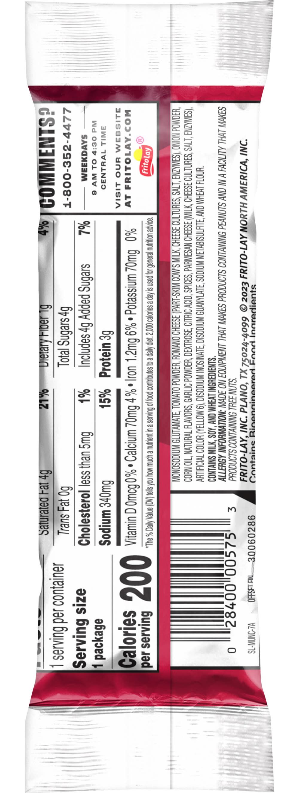 Ingredients: Enriched WHEAT Flour (Unbleached WHEAT Flour, Niacin, Reduced Iron, Thiamin Mononitrate, Riboflavin, Folic Acid), Vegetable Oil (Palm And Canola Oil [With Tbhq To Preserve Freshness]), Sugar, Maltodextrin (Made From Corn), Modified Food Starch, Corn Starch, Salt, Cheddar Cheese (Milk, Cheese Cultures, Salt, Enzymes), Buttermilk, And Less Than 2% Of Leavening (Ammonium Bicarbonate, Monocalcium Phosphate, Baking Soda), Whey Protein Concentrate, Whey, Corn Syrup, SOY Lecithin, Monosodium Glutamate, Tomato Powder, Romano Cheese (Part-Skim Cow'S Milk, Cheese Cultures, Salt, Enzymes), Onion Powder, Corn Oil, Natural Flavors, Garlic Powder, Dextrose, Citric Acid, Spices, Parmesan Cheese (Milk, Cheese Cultures, Salt, Enzymes), Artificial Color (Yellow 6), Disodium Inosinate, Disodium Guanylate, Sodium Metabisulfite, And WHEAT Flour. . CONTAINS MILK, SOY, AND WHEAT INGREDIENTS. ALLERGY INFORMATION: MADE ON EQUIPMENT THAT MAKES PRODUCTS CONTAINING PEANUTS AND IN A FACILITY THAT MAKES PRODUCTS CONTAINING TREE NUTS. Contains: CONTAINS MILK, SOY, AND WHEAT INGREDIENTS. \nALLERGY INFORMATION: MADE ON EQUIPMENT THAT MAKES PRODUCTS CONTAINING PEANUTS AND IN A FACILITY THAT MAKES PRODUCTS CONTAINING TREE NUTS.