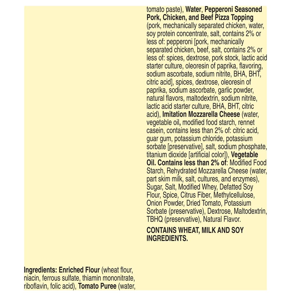 Ingredients: Enriched Flour (Wheat Flour, Niacin, Ferrous Sulfate, Thiamin Mononitrate, Riboflavin, Folic Acid), Tomato Puree (Water, Tomato Paste), Water, Pepperoni Seasoned Pork, Chicken, and Beef Pizza Topping (Pork, Mechanically Separated Chicken, Water, Soy Protein Concentrate, Salt, Contains 2% or Less of: Pepperoni [Pork, Mechanically Separated Chicken, Beef, Salt, Contains 2% or Less of: Spices, Dextrose, Pork Stock, Lactic Acid Starter Culture, Oleoresin of Paprika, Flavoring, Sodium Ascorbate, Sodium Nitrite, BHA, BHT, Citric Acid], Spices, Dextrose, Oleoresin of Paprika, Sodium Ascorbate, Garlic Powder, Natural Flavors, Maltodextrin, Sodium Nitrite, Lactic Acid Starter Culture, BHA, BHT, Citric Acid), Imitation Mozzarella Cheese (Water, Vegetable Oil, Modified Food Starch, Rennet Casein, Contains Less than 2% of: Citric Acid, Guar Gum, Potassium Chloride, Potassium Sorbate [Preservative], Salt, Sodium Phosphate, Titanium Dioxide [Artificial Color]), Vegetable Oil. Contains Less than 2% of: Modified Food Starch, Rehydrated Mozzarella Cheese (Water, Part Skim Milk, Salt, Cultures, and Enzymes), Sugar, Salt, Modified Whey, Defatted Soy Flour, Spice, Citrus Fiber, Methylcellulose, Onion Powder, Dried Tomato, Potassium Sorbate (Preservative), Dextrose, Maltodextrin, TBHQ (Preservative), Natural Flavor Contains: Wheat, Milk, Soybeans