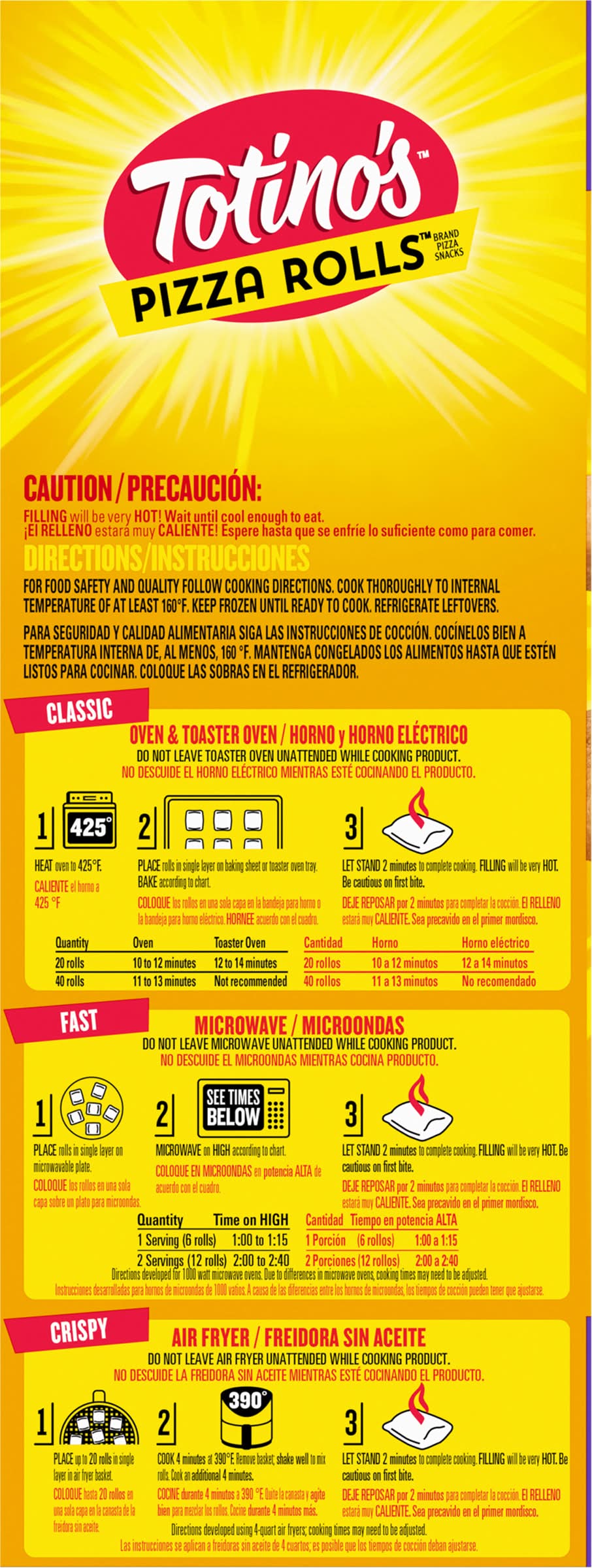 Directions for use: Cook thoroughly. Directions: For food safety and quality follow cooking directions. Cook thoroughly to internal temperature of at least 160 degrees F. Keep frozen until ready to cook. Refrigerate leftovers. Classic: Oven & toaster oven: do not leave toaster oven unattended while cooking product. 1. Heat oven to 425 degrees F. 2. Place rolls in single layer on baking sheet or toaster oven tray. 3. Bake according to chart. Let stand 2 minutes to complete cooking. Filling will be very hot. Be cautious on first bite. Quantity: 20 rolls; Oven: 10 to 12 minutes; Toaster oven: 13 to 15 minutes; Quantity: 40 rolls; Oven: 13 to 15 minutes. Toaster oven: Not recommended. Fast: Microwave: Do not leave microwave unattended while cooking product. 1. Place rolls in single layer on microwavable plate. 2. Microwave on high according to chart. 3. Let stand 2 minutes to complete cooking. Filling will be very hot. Be cautions on first bite. Quantity: 1 serving (6 rolls); Time on high: 1:00 to 1:15; Quantity: 2 servings (12 rolls); Time on high: 2:00 to 2:40. Direction developed for 1000 watt microwave ovens. Due to differences in mircrowave ovens, cooking times may need to be adjusted. Crispy: Air fryer: do not leave air fryer unattended while cooking product. Do not leave air fryer unattended while cooking product. 1. Place up to 25 rolls in single layer in air fryer basket. 2. Cook 4 minutes at 390 degrees F. Remove basket, shake well to mix rolls. Cook an additional 4 minutes. 3. Let stand 2 minutes to complete cooking. Filling will be very hot. Be cautions on first bite. Directions developed using 4 - quart air fryers; cooking times may need to be adjusted. Caution: Filling will be very hot! Wait until cool enough to eat. Keep frozen. Lift to open. Storage recommendation: Keep frozen.