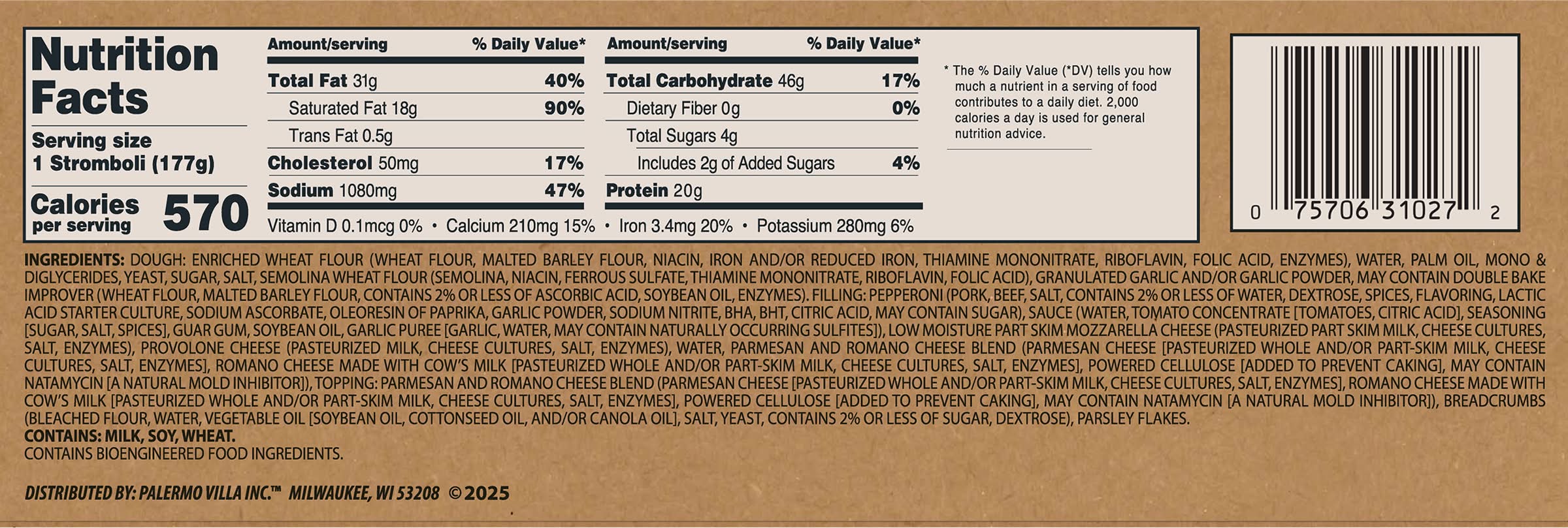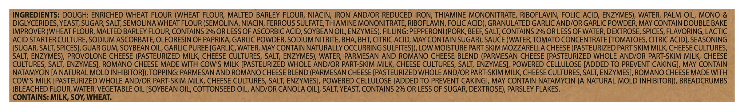 Ingredients: Dough: Enriched Wheat Flour (Wheat Flour, Malted Barley Flour, Niacin, Iron and/or Reduced Iron, Thiamine Mononitrate, Riboflavin, Folic Acid, Enzymes), Water, Palm Oil, Mono & Diglycerides, Yeast, Sugar, Salt, Semolina Wheat Flour (Semolina, Niacin, Ferrous Sulfate, Thiamine Mononitrate, Riboflavin, Folic Acid), Granulated Garlic and/or Garlic Powder, May Contain Double Bake Improver (Wheat Flour, Malted Barley Flour, Contains 2% or Less of Ascorbic Acid, Soybean Oil, Enzymes). Filling: Pepperoni (Pork, Beef, Salt, Contains 2% or Less of Water, Dextrose, Spices, Flavoring, Lactic Acid Starter Culture, Sodium Ascorbate, Oleoresin of Paprika, Garlic Powder, Sodium Nitrite, BHA, BHT, Citric Acid, May Contain Sugar), Sauce (Water, Tomato Concentrate [Tomatoes, May Contain Citric Acid], Seasoning [Sugar, Salt, Spices], Guar Gum, Soybean Oil, Garlic Puree [Garlic, Water, May Contain Naturally Occurring Sulfites]), Low Moisture Part Skim Mozzarella Cheese (Pasteurized Part Skim Milk, Cheese Cultures, Salt, Enzymes), Provolone Cheese (Pasteurized Milk, Cheese Cultures, Salt, Enzymes), Water, Parmesan and Romano Cheese Blend (Parmesan Cheese [Pasteurized Milk, Cheese Cultures, Salt, Rennet], Romano Cheese Made with Cow's Milk [Pasteurized Milk, Cheese Cultures, Salt, Rennet], Powdered Cellulose [Anti-Caking], Salt). Topping: Parmesan and Romano Cheese Blend (Parmesan Cheese [Pasteurized Part Skim Milk, Cheese Cultures, Salt, Enzymes], Romano Cheese Made with Cow's Milk [Pasteurized Milk, Cheese Cultures, Salt, Enzymes], Powdered Cellulose [Anti-Caking] and/or Starch Blend [Anti-Caking], Salt), Breadcrumbs (Bleached Flour, Water, Vegetable Oil [Soybean Oil, Cottonseed Oil, and/or Canola Oil], Salt, Yeast, Contains 2% or Less of Sugar, Dextrose), Parsley Flakes Contains: Milk, Soybeans, Wheat, Barley, Sulfites