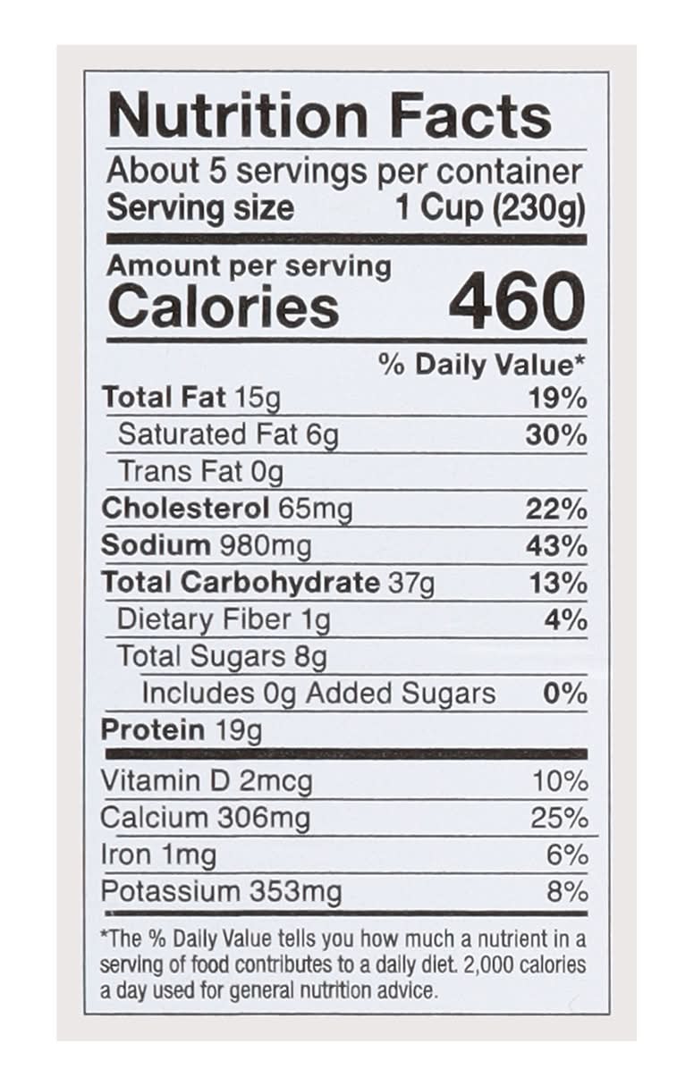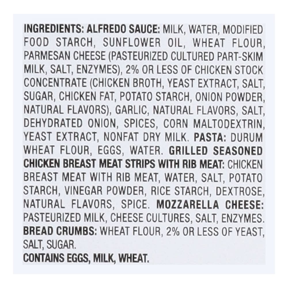 Ingredients: Alfredo Sauce: Milk, Water, Modified Food Starch, Sunflower Oil, Wheat Flour, Parmesan Cheese (Pasteurized Cultured Part-Skim Milk, Salt, Enzymes), 2% or Less of Chicken Stock Concentrate (Chicken Broth, Yeast Extract, Salt, Sugar, Chicken Fat, Potato Starch, Onion Powder, Natural Flavors), Garlic, Natural Flavors, Salt, Dehydrated Onion, Spices, Corn Maltodextrin, Yeast Extract, Nonfat Dry Milk. Pasta: Durum Wheat Flour, Eggs, Water, Grilled Seasoned Chicken Breast Meat Strips with Rib Meat: Chicken Breast Meat with Rib Meat, Water, Salt, Potato Starch, Vinegar Powder, Rice Starch, Dextrose, Natural Flavors, Spice. Mozzarella Cheese: Pasteurized Milk, Cheese Cultures, Salt, Enzymes. Bread Crumbs: Wheat Flour, 2% or Less of Yeast, Salt, Sugar Contains: Eggs, Milk, Wheat