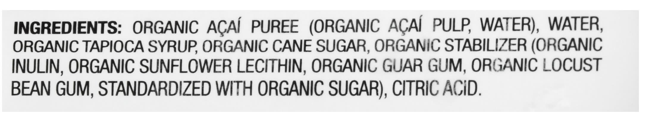 Ingredients: Organic Acai Puree (Organic Acai Pulp, Water), Water, Organic Tapioca Syrup, Organic Cane Sugar, Organic Stabilizer (Organic Inulin, Organic Sunflower Lecithin, Organic Gum Gum, Organic Locust Bean Gum, Standardized with Organic Sugar), Citric Acid