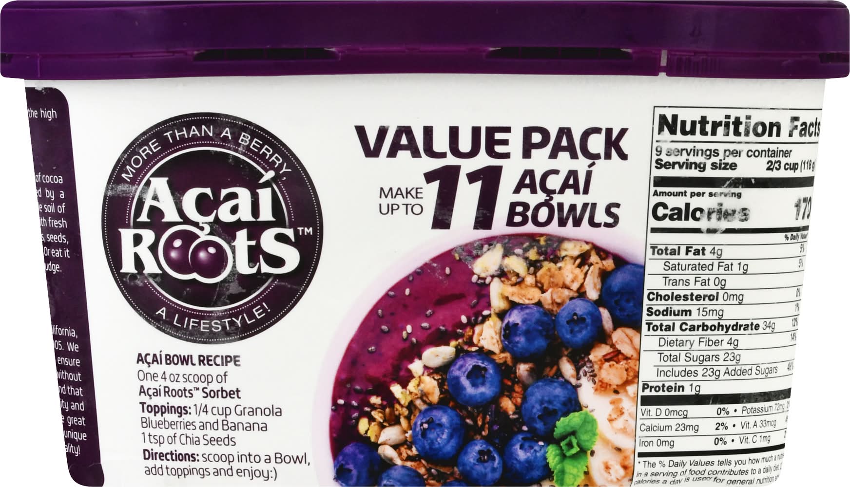 Directions for use: Acai Bowl Recipe: One 4 oz scoop of Acai Roots sorbet. Toppings: 1/4 cup granola blueberries and banana 1 tsp of chia seeds. Directions: Scoop into a bowl, add toppings and enjoy. Keep frozen. Storage recommendation: Keep frozen.