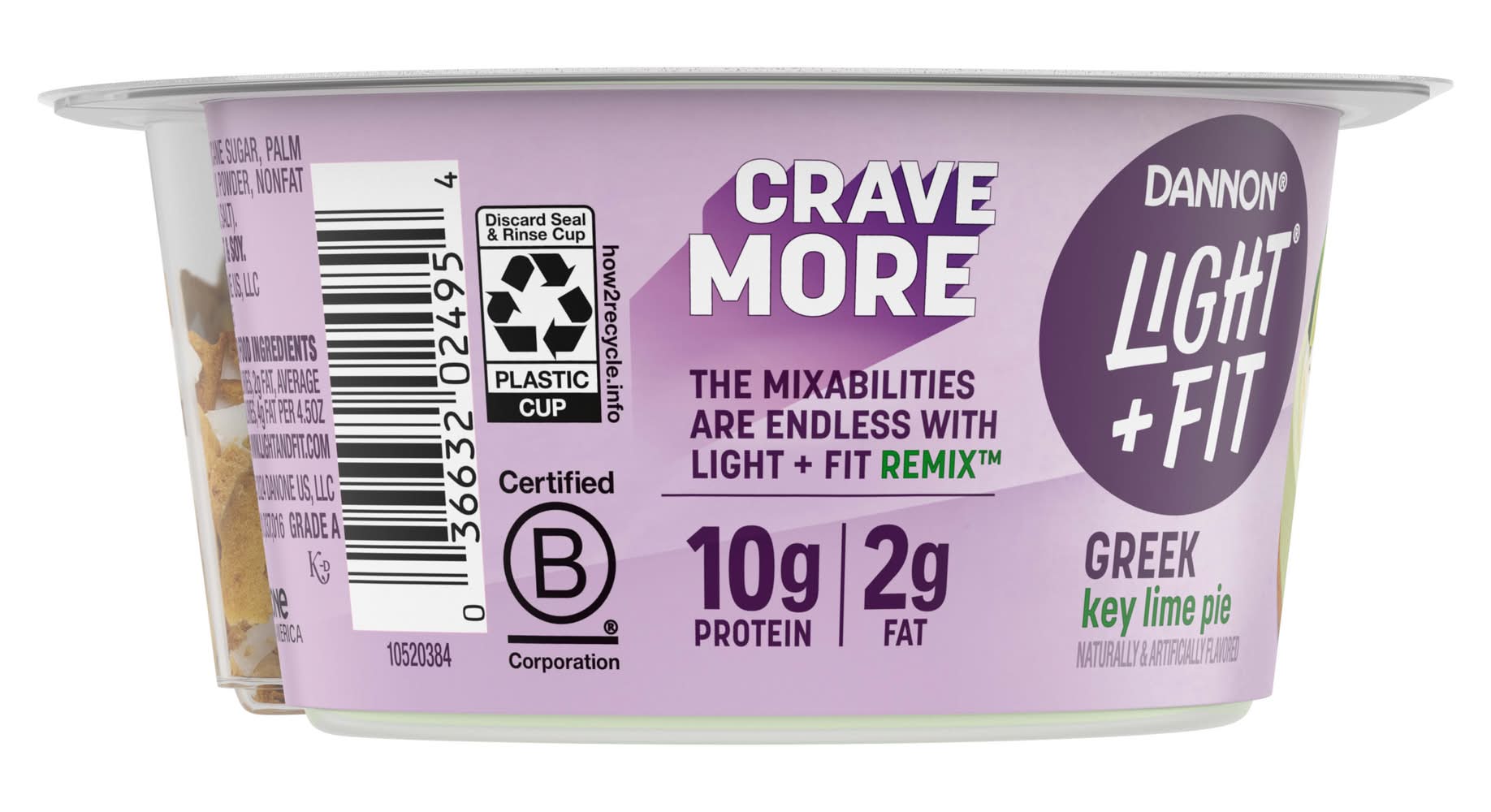 Looking for a delicious fat free yogurt with a fierce flavor and craveable mix-ins? Give your taste buds a reason to rejoice with Dannon Light + Fit REMIX Key Lime Pie Fat Free Greek Yogurt with Graham Cookies and White Fudge Chunks Mix-Ins. Remix your snacks and treat yourself with graham cookies and white fudge chunks over Greek key lime fat free yogurt. Every bite of this REMIX light yogurt* snack cup has a taste that just keeps bringing it, making it easy to enjoy snacks you can feel good about having on repeat. At Light + Fit, our goal is to help you do you while balancing a healthy diet by serving up some delightfully creamy Greek yogurt with sensational flavor. Light + Fit REMIX fat free Greek yogurt comes in single-serve cups, so you can live your life uninterrupted and enjoy them on the go. Protein is an essential nutrient we need in our diets, and with 120 calories and 10 grams of protein per 4.5 ounce serving, this Light + Fit yogurt is a deliciously satisfying and convenient option for adding complete protein every day.  Knockout taste. Epic mix-ins. Snacking mic-drops. That’s REMIX. It’s the party crew of snacking you can feel great about. Go full-on fierce, mix it up and take your snacking routine. Pack a few Light + Fit REMIX yogurt cups and enjoy at work or as an on the go snack. Or grab a cup to make breakfast and home snacking more craveable. The mixabilities are endless with Light + Fit REMIX. *50% less fat than average yogurt with mix-ins; Light & Fit Remix: 120 calories, 2g fat; Average yogurt with mix-ins: 155 calories, 4g fat per 4.5oz. Flavor: Key lime pie