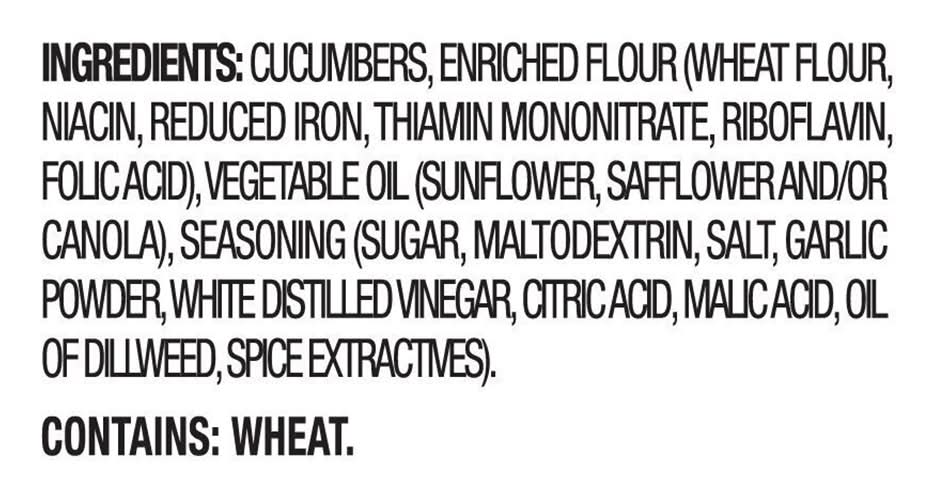 Ingredients: Cucumbers Enriched Flour (Wheat Flour, Niacin, Reduced Iron, Thiamin Mononitrate, Riboflavin, Folic Acid) Sunflower Safflower and/or Canola Oil, Seasoning (Sugar, Maltodextrin, Salt, Garlic Powder, White Distilled Vinegar, Citric Acid, Malic Acid, Oil of Dillweed Spice Extractives). Contains: Wheat Tree Nuts