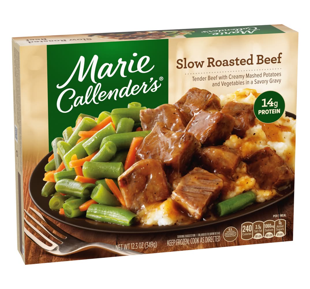 Put the taste of homemade flavor on your table with Marie Callender's Slow Roasted Beef. Marie Callender's frozen dinners are convenient meals that bring back the homestyle cooking you crave. Featuring a slow roasted beef paired with creamy mashed potatoes and crisp vegetables, then covered in a rich, savory made-from-scratch gravy, this frozen entree offers a warm, savory taste. This frozen beef dinner is made with wholesome ingredients and no artificial flavors or colors and contains 14 grams of protein per serving. For microwave preparation, microwave this frozen dinner for 3 1/2 minutes, stir potatoes, re-cover and cook an additional 2 1/2 to 3 1/2 minutes. Let stand for 2 minutes. For conventional oven preparation, place ready made meals in an oven heated to 350 degrees and bake for 35 to 40 minutes, let stand for 2 minutes, and check that food is cooked thoroughly before eating. Whether you're feeding yourself or the whole family, Marie Callender's frozen pot pies and frozen dinners are perfect quick meals for any occasion. This 12.3 oz Marie Callender's Slow Roasted Beef frozen meal should be kept in your freezer until ready to prepare. Enjoy the combination of warm, hearty and delicious ingredients in Marie Callender's frozen entrees and microwave meals for a homemade, comfort food taste. • Conagra Brands, Chicago, IL, 60654 • Packaging: Reusable