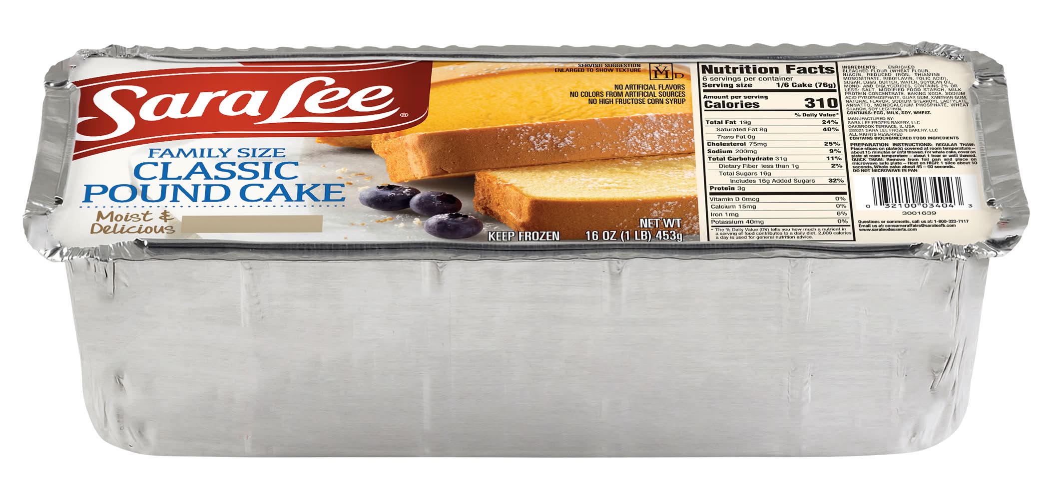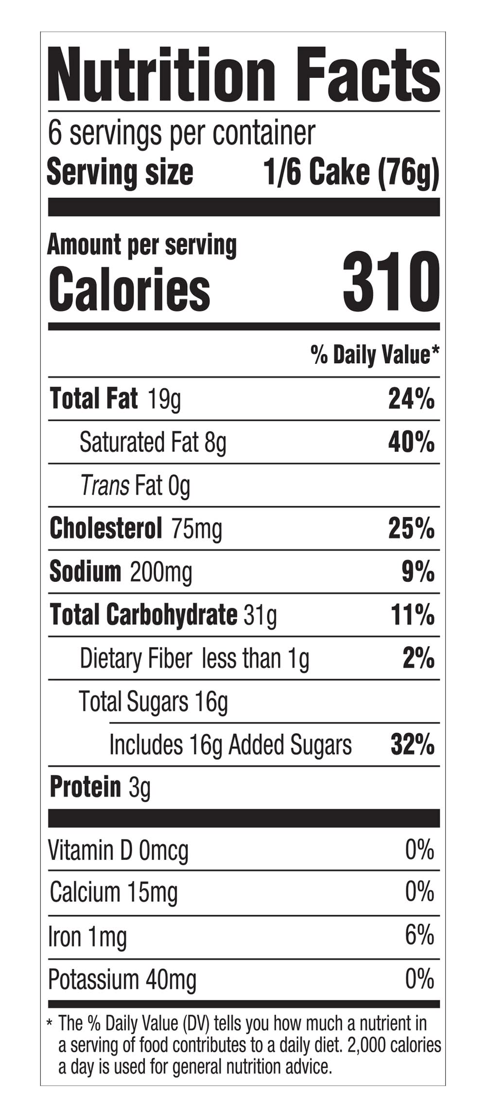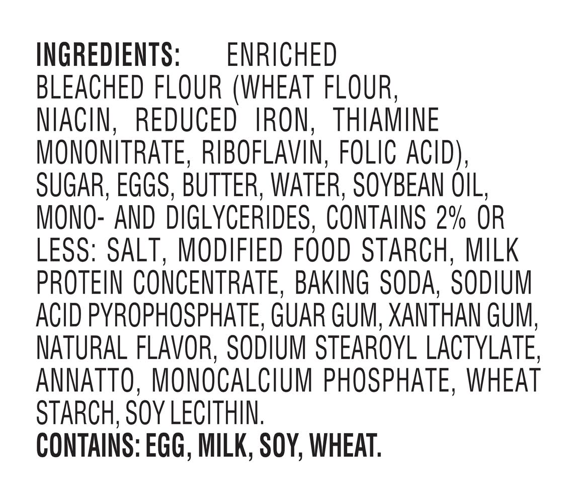 Ingredients: Enriched Bleached Flour (Wheat Flour, Niacin, Reduced Iron, Thiamine Mononitrate, Riboflavin, Folic Acid), Sugar, Eggs, Butter, Water, Soybean Oil, Mono- and Diglycerides, Contains 2% or Less: Salt, Modified Food Starch, Milk Protein Concentrate, Baking Soda, Sodium Acid Pyrophosphate, Guar Gum, Xanthan Gum, Natural Flavor, Sodium Stearoyl Lactylate, Annatto, Monocalcium Phosphate, Wheat Starch, Soy Lecithin Contains: Eggs, Milk, Soybeans, Wheat