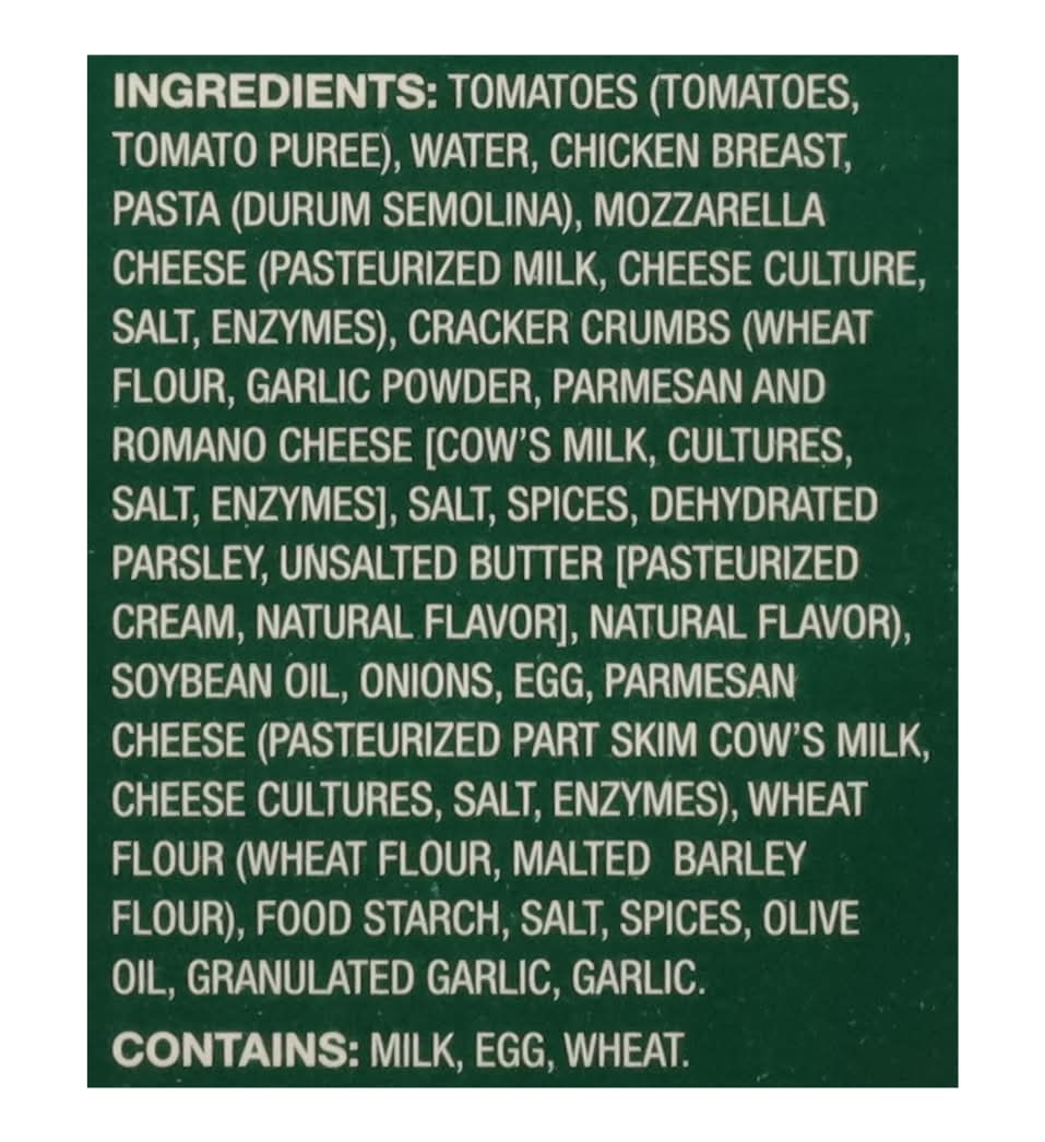 Ingredients: Tomatoes (Tomatoes, Salt), Water, Chicken Breast, Pasta (Durum Semolina), Mozzarella Cheese (Pasteurized Milk, Cheese Culture, Salt, Enzymes), Tomatoes, Cracker Crumbs (Wheat Flour, Garlic Powder, Parmesan and Romano Cheese Cow's Milk Cultures, Salt, Enzymes), Salt, Spices, Dehydrated Parsley, Unsalted Butter (Pasteurized Cream, Natural Flavor), Natural Flavor), Soy Oil, Onions, Egg, Parmesan Cheese (Pasteurized Part Skim Cow's Milk, Cheese Cultures, Salt, Enzymes), Wheat Flour (Wheat Flour, Malted Barley Flour), Corn Starch, Salt, Spices, Olive Oil, Granulated Garlic, Garlic