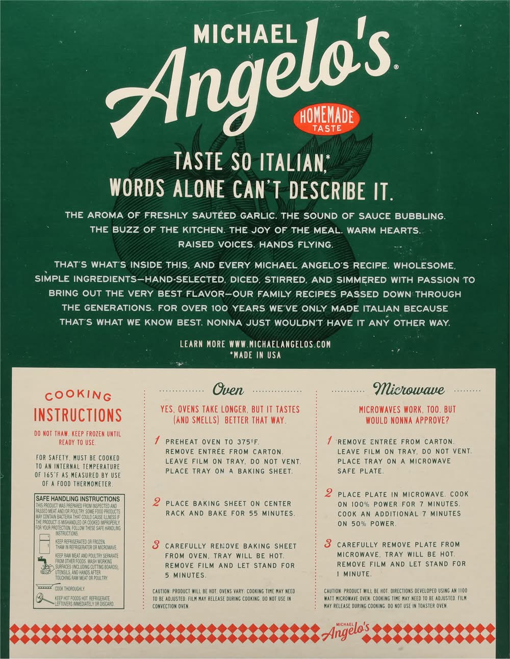 Directions for use: Cooking Instructions: Do not thaw. Keep frozen until ready to use. For safety. Must be cooked to an internal temperature of 165 degrees F as measured by use of a food thermometer. Oven: Yes. Ovens take longer, but it tastes (and smells) better that way. One Preheat oven to 400 degrees F remove entree from carton. Two Place tray on cookie sheet on center rack of oven (6-8 inch from heating element), cook with film on for 45-50 minutes. There Carefully remove entree from oven. Remove film, and let stand for minutes before serving. Microwave: Microwaves work. Too. But would nonna approve? One Remove entree from carton. Two Place tray in microwave with film on and cook for 12-14 minutes. Three Carefully remove entree from microwave, remove film, and let stand for 2 minutes before serving. Keep frozen & cook thoroughly. Storage recommendation: Keep frozen & cook thoroughly.