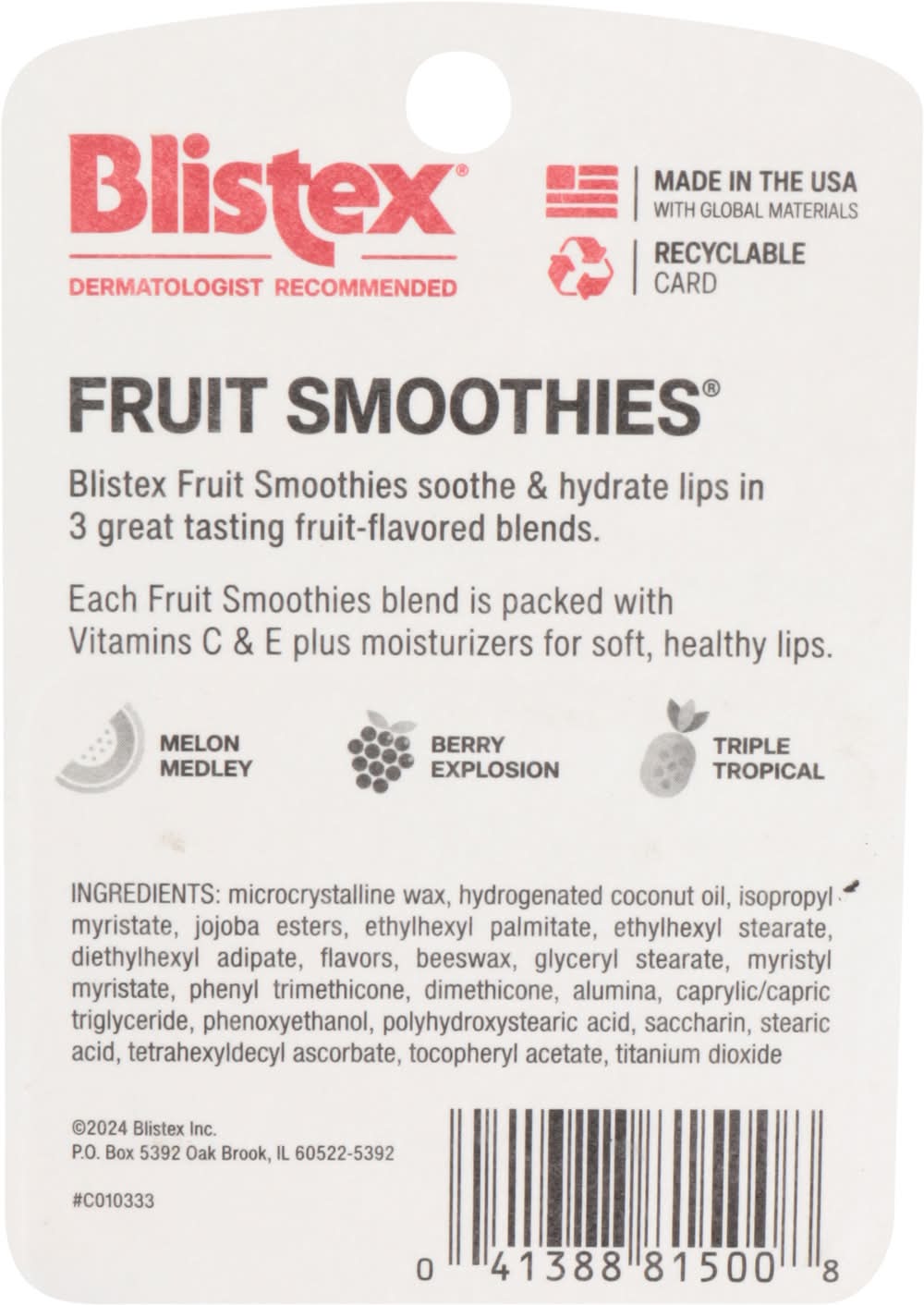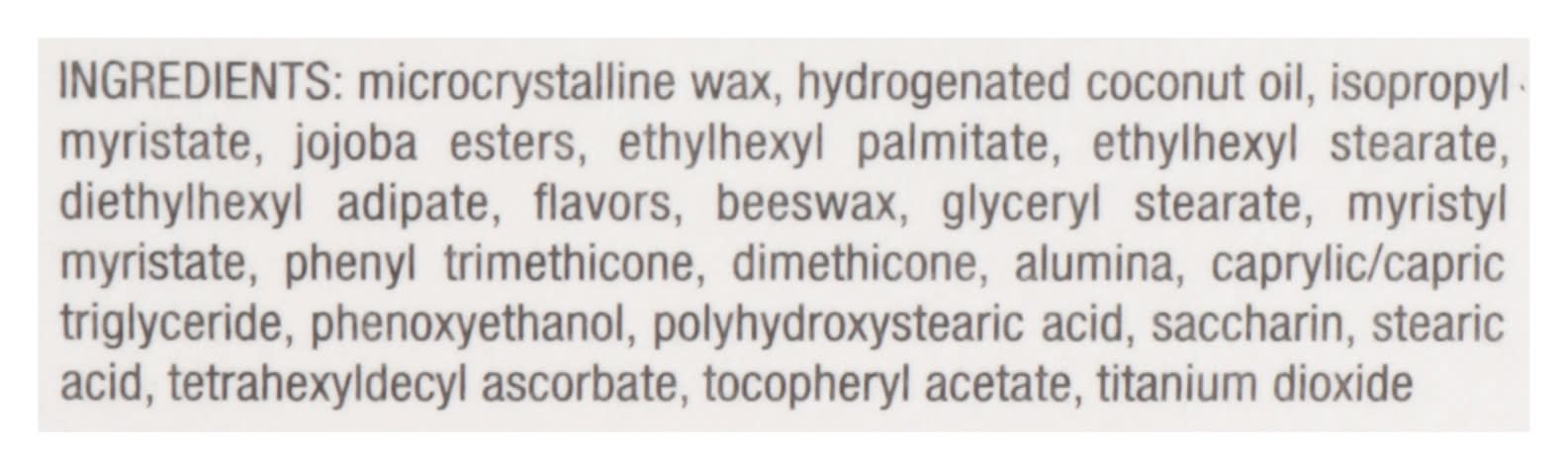 Ingredients: Melon Medley: Microcrystalline Wax, Hydrogenated Coconut Oil, Isopropyl Myristate, Jojoba Esters, Ethylhexyl Palmitate, Ethylhexyl Stearate, Diethylhexyl Adipate, Flavors, Beeswax, Glyceryl Stearate, Myristyl Myristate, Phenyl Trimethicone, Dimethicone, Alumina, Caprylic/Capric Triglyceride, Phenoxyethanol, Polyhydroxystearic Acid, Saccharin, Stearic Acid, Tetrahexyldecyl Ascorbate, Tocopheryl Acetate, Titanium Dioxide. Berry Explosion: Microcrystalline Wax, Hydrogenated Coconut Oil, Isopropyl Myristate, Jojoba Esters, Ethylhexyl Palmitate, Ethylhexyl Stearate, Diethylhexyl Adipate, Flavors, Beeswax, Glyceryl Stearate, Myristyl Myristate, Phenyl Trimethicone, Dimethicone, Alumina, Caprylic/Capric Triglyceride, Phenoxyethanol, Polyhydroxystearic Acid, Saccharin, Stearic Acid, Tetrahexyldecyl Ascorbate, Tocopheryl Acetate, Titanium Dioxide. Triple Tropical: Microcrystalline Wax, Hydrogenated Coconut Oil, Isopropyl Myristate, Jojoba Esters, Ethylhexyl Palmitate, Ethylhexyl Stearate, Diethylhexyl Adipate, Flavors, Beeswax, Glyceryl Stearate, Myristyl Myristate, Phenyl Trimethicone, Dimethicone, Alumina, Caprylic/Capric Triglyceride, Phenoxyethanol, Polyhydroxystearic Acid, Saccharin, Stearic Acid, Tetrahexyldecyl Ascorbate, Tocopheryl Acetate, Titanium Dioxide