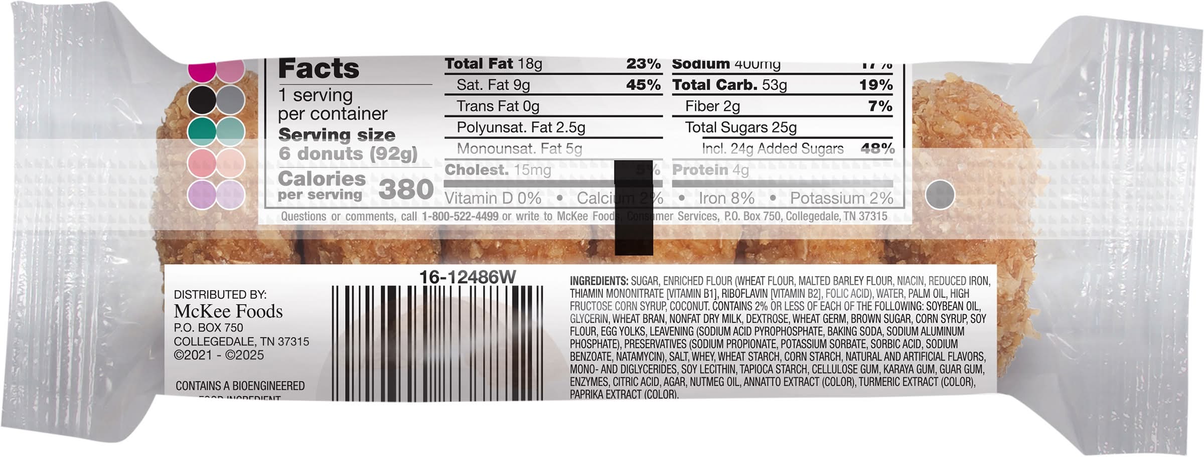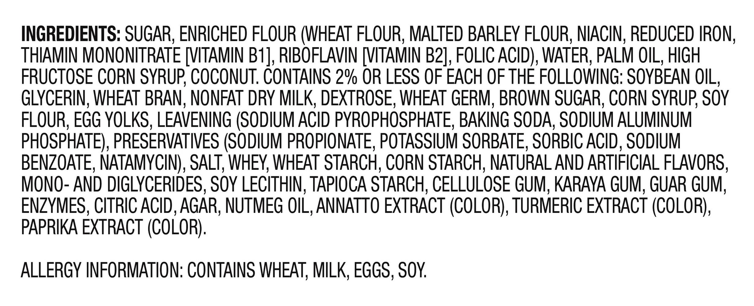 Ingredients: Sugar, Enriched Flour (Wheat Flour, Malted Barley Flour, Niacin, Reduced Iron, Thiamin Mononitrate [Vitamin B1], Riboflavin [Vitamin B2], Folic Acid), Water, Palm Oil, High Fructose Corn Syrup, Coconut, Contains 2% or Less of Each of the Following: Soybean Oil, Glycerin, Wheat Bran, Nonfat Dry Milk, Dextrose, Wheat Germ, Brown Sugar, Corn Syrup, Soy Flour, Egg Yolks, Leavening (Sodium Acid Pyrophosphate, Baking Soda, Sodium Aluminum Phosphate), Preservatives (Sodium Propionate, Potassium Sorbate, Sorbic Acid, Sodium Benzoate, Natamycin), Salt, Whey, Wheat Starch, Corn Starch, Natural and Artificial Flavors, Mono- and Diglycerides, Soy Lecithin, Tapioca Starch, Cellulose Gum, Karaya Gum, Guar Gum, Enzymes, Citric Acid, Agar, Nutmeg Oil, Annatto Extract (Color), Turmeric Extract (Color), Paprika Extract (Color) Contains: Wheat, Barley, Soybeans, Milk, Eggs