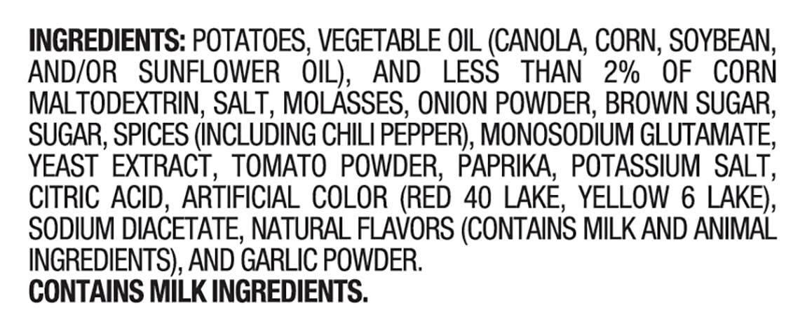 Ingredients: Potatoes, Vegetable Oil (Canola, Corn, Soybean, and/or Sunflower Oil), and Less than 2% of Corn Maltodextrin, Salt, Molasses, Onion Powder, Brown Sugar, Sugar, Spices (Including Chili Pepper), Monosodium Glutamate, Yeast Extract, Tomato Powder, Paprika, Potassium Salt, Citric Acid, Artificial Color (Red 40 Lake, Yellow 6 Lake), Sodium Diacetate, Natural Flavors (Contains Milk and Animal Ingredients), and Garlic Powder Contains: Milk, Soybeans