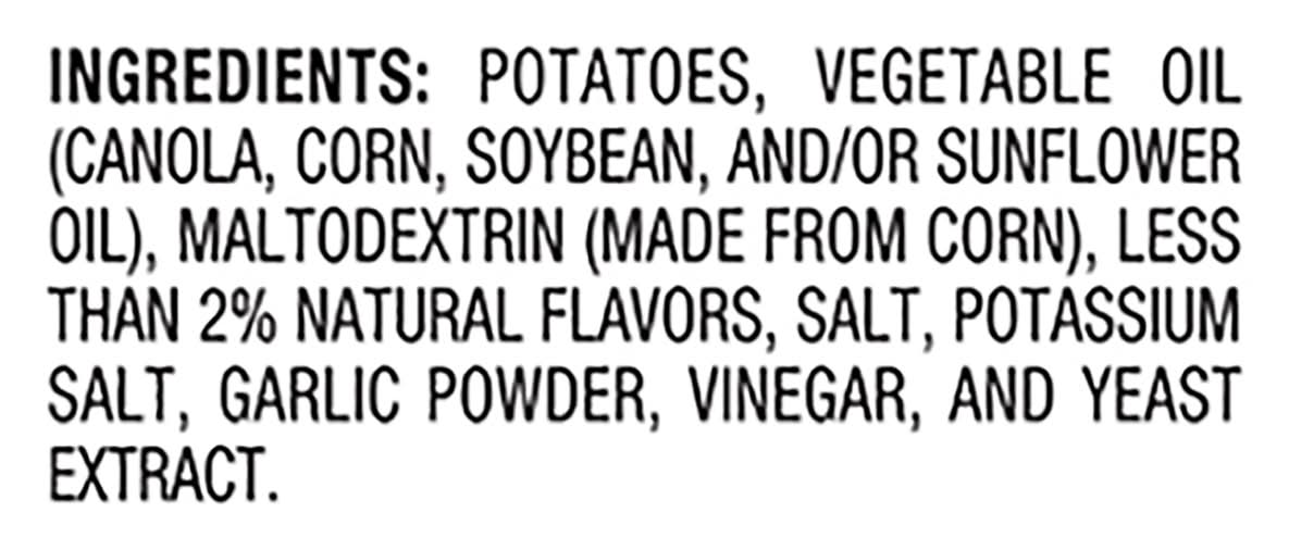 Ingredients: Potatoes, Vegetable Oil (Canola, Corn, Soybean, and/or Sunflower Oil), Maltodextrin (Made from Corn), Less than 2% Natural Flavors, Salt, Potassium Salt, Garlic Powder, Vinegar, and Yeast Extract Contains: Soybeans