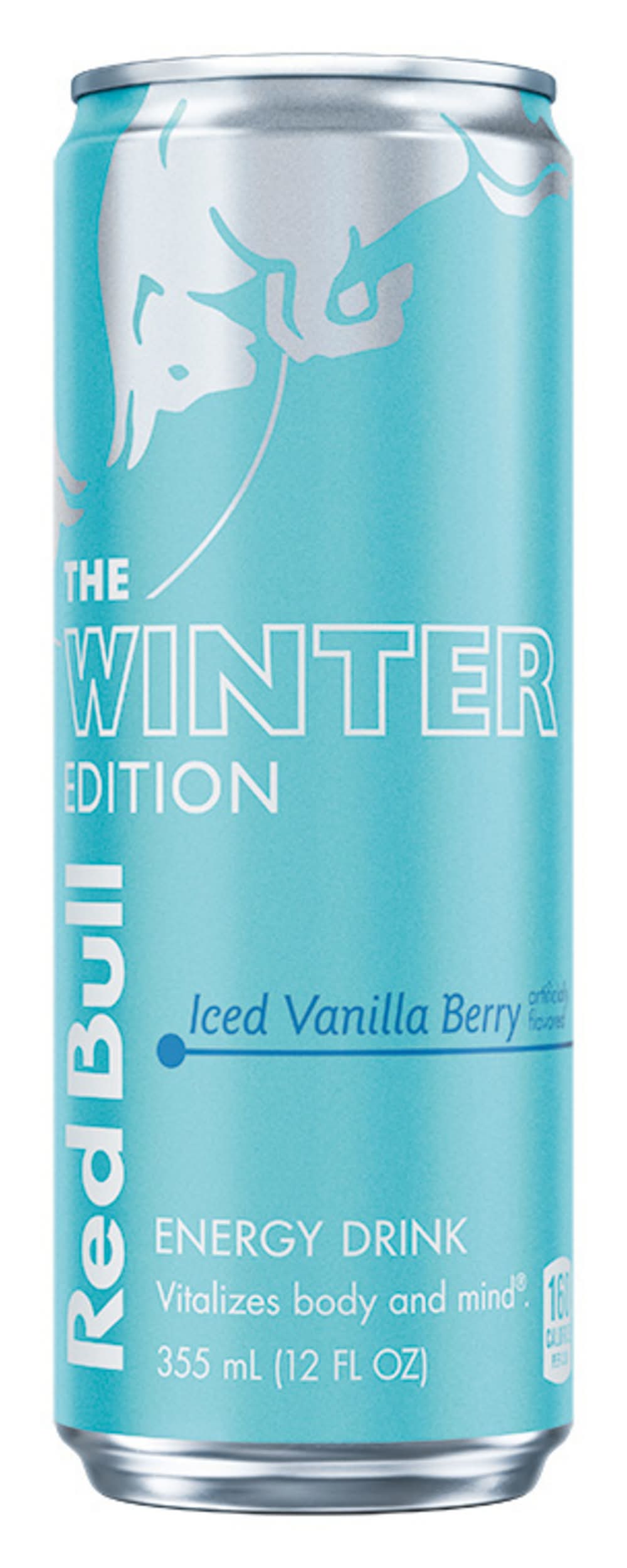 Red Bull Winter Edition features exceptional taste of Blueberry, Vanilla, and icy-fresh notes of eucalyptus. This lightly carbonated beverage is enjoyed worldwide by fitness enthusiasts, athletes, gamers, students and travelers. A refreshing can of Red Bull makes an excellent partner for busy, active lifestyles. Each 12 fl oz can contains 114mg of caffeine per serving and 38g of sugar (comparable to sugar levels found in apple juice). It also includes Taurine, an amino acid naturally occurring in the human body, and B-group vitamins B6, B12, Niacin (B3) and Pantothenic Acid (B5). Available in single can, 4-packs, and 24-packs. Comes in aluminum cans that can be recycled over and over. Always check can labels for the most updated product nutritional and ingredient information. Calcium and sugars values declared on labels may vary slightly depending on production locations. Always check can labels for most updated product nutritional and ingredient information. Calcium and sugars values declared on labels may vary slightly depending on production locations. Flavor: Iced vanilla berry