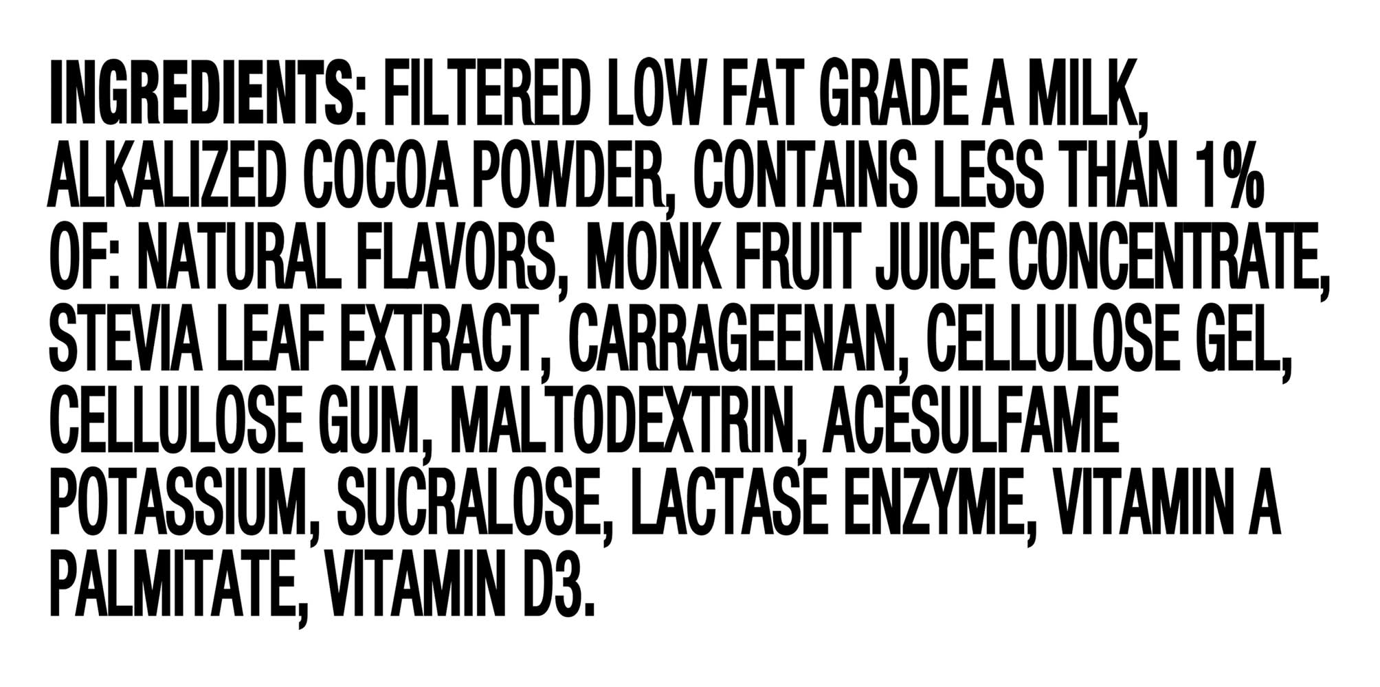 Ingredients: Filtered Low Fat Grade A Milk, Alkalized Cocoa Powder, Contains Less than 1% of: Natural Flavors, Monk Fruit Juice Concentrate, Stevia Leaf Extract, Carrageenan, Cellulose Gel, Cellulose Gum, Maltodextrin, Acesulfame Potassium, Sucralose, Lactase Enzyme, Vitamin A Palmitate, Vitamin D3 Contains: Milk