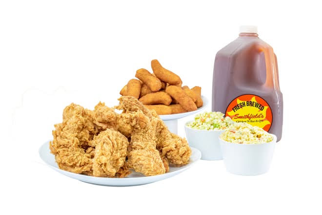 Ten Pieces of Hand Breaded Chicken Tenders, Two Sides, Two Dozen Hushpuppies, and a Gallon of Tea
