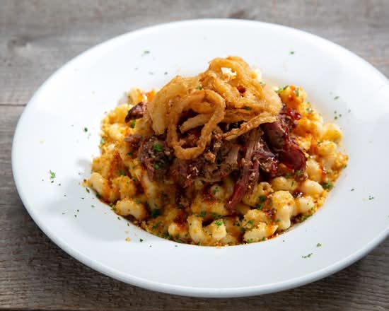 Smoked Gouda, Cheddar Jack, pasta, a breadcrumb topping, parsley, topped with your choice of meat, onion tanglers, and BBQ Sauce.