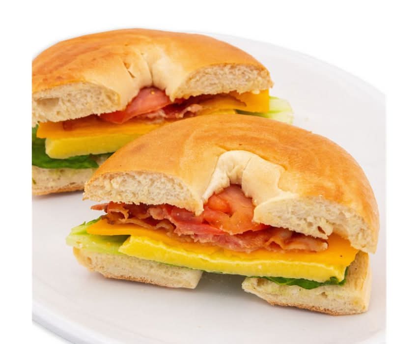 Crisp bacon, whole egg patty, lettuce, ripe tomato and cheddar cheese on a toasted bagel.