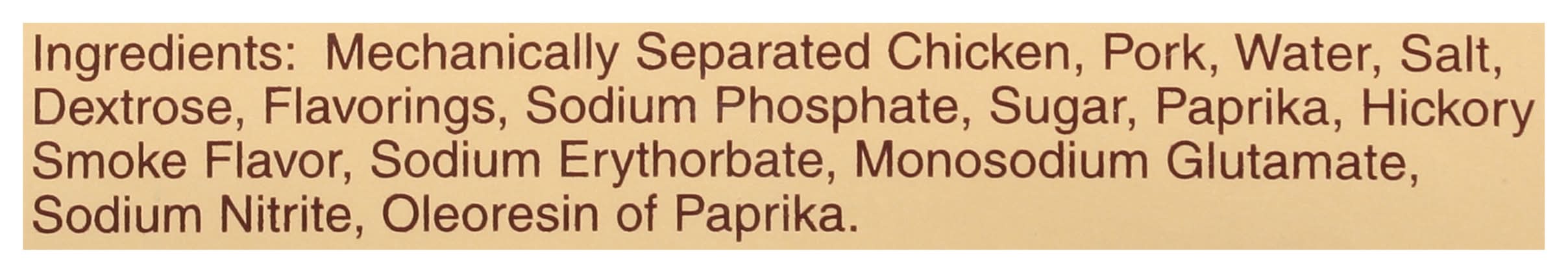 Ingredients: Mechanically Separated Chicken, Pork, Water, Salt, Dextrose, Flavorings, Sodium Phosphate, Sugar, Paprika, Hickory Smoke Flavor, Sodium Erythorbate, Monosodium Glutamate, Sodium Nitrite, Oleoresin of Paprika Contains: Tree Nuts, Hickory Nuts
