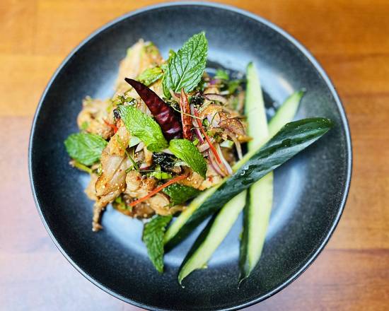 Grilled pork salad tossed in chili and various fragrant Thai herbs, lime dressing, toasted rice powder and crunchy shallot.