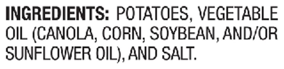 Ingredients: Potatoes, Vegetable Oil (Canola, Corn, Soybean, and/or Sunflower Oil), and Salt Contains: Soybeans