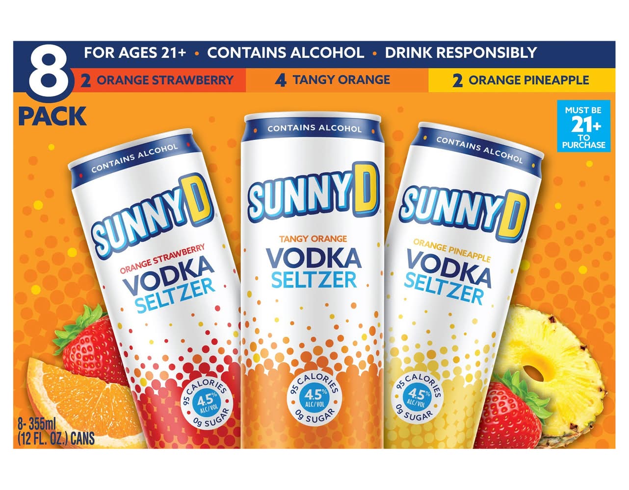 Vodka with Real Fruit Juice, Sparkling Water, Natural Orange Flavor and Other Natural Flavors We took your favorite legendary orange flavor and added vodka to create a delightful drinking experience that tastes like you're sipping on sunshine. • Brand: Sunny d • Flavor: Assorted • Pack size: 8 • kosher, gluten-free, • Alcohol by volume: 4.5%