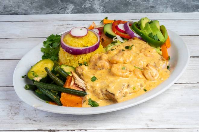 Chicken Breast, Shrimp and Crab Meat Dill Cream Sauce, Vegetables, Rice